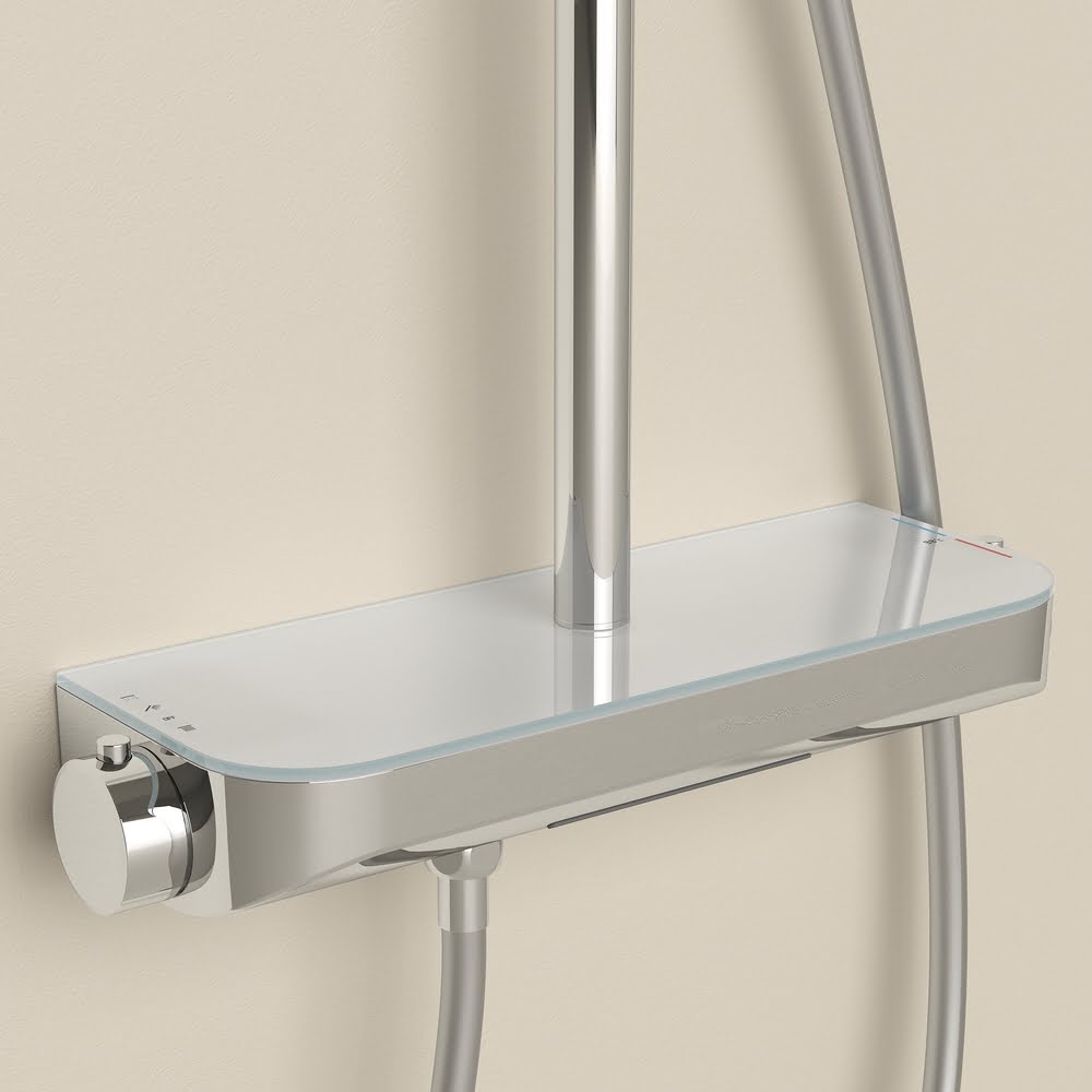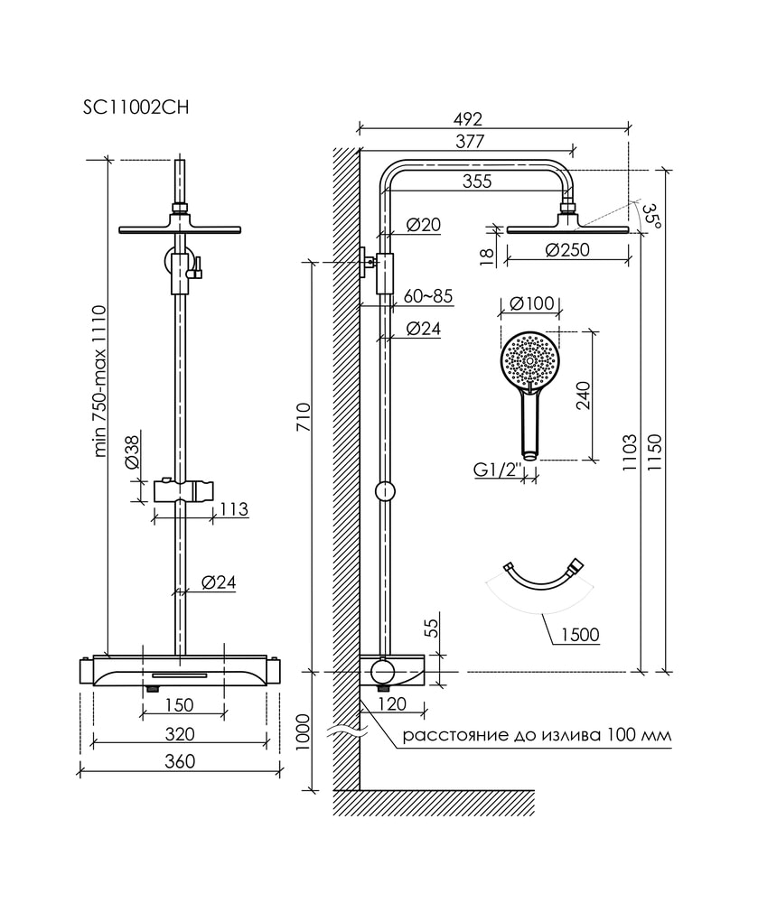 Душевая стойка с термостатическим смесителем SC11001CH Sancos Teo Хром глянцевый/Италия: — душевая стойка, смеситель с изливом и термостатом, полкой из закалённого стекла (прочное и стильное место для гигиенических принадлежностей). Возможность регулировки высоты и наклона ручного душа. Верхний душ из металла с регулировкой наклона. Возможность регулировки высоты штанги: 750-1100 мм. Ручной душ — 3 режима с кнопкой переключения. Оснащение — Смеситель с термостатом, штанга, верхний и ручной душ с держателем, шланг 1500 мм.. Гарантия — 60 месяцев! Доставка!