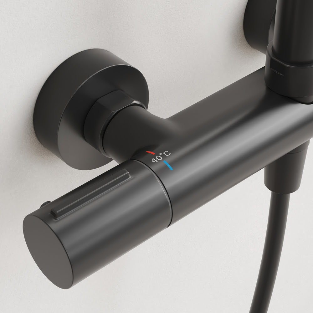 Душевая стойка с термостатическим смесителем SC9007MB SANCOS Etna черный матовый/Италия: душевая стойка со встроенным термостатом. Термостат с высокочувствительным катриджем SEDAL (Испания) мгновенно настраивает желаемую температуру воды. Предустановленный ограничитель температуры при 40°. Система защиты от ожогов при отключении холодной воды. Встроенный клапан защиты от обратного потока!!! Интегрированный в корпус смесителя переключатель потоков воды. Возможность регулировки штанги по высоте. Верхний душ 250 мм с возможностью настройки наклона. Ручной душ 207*28 мм , три режима с кнопкой переключения. Гибкий шланг с системой защиты от перекручивания — 1,5 м., материал — пластик. Цвет — чёрный матовый.
