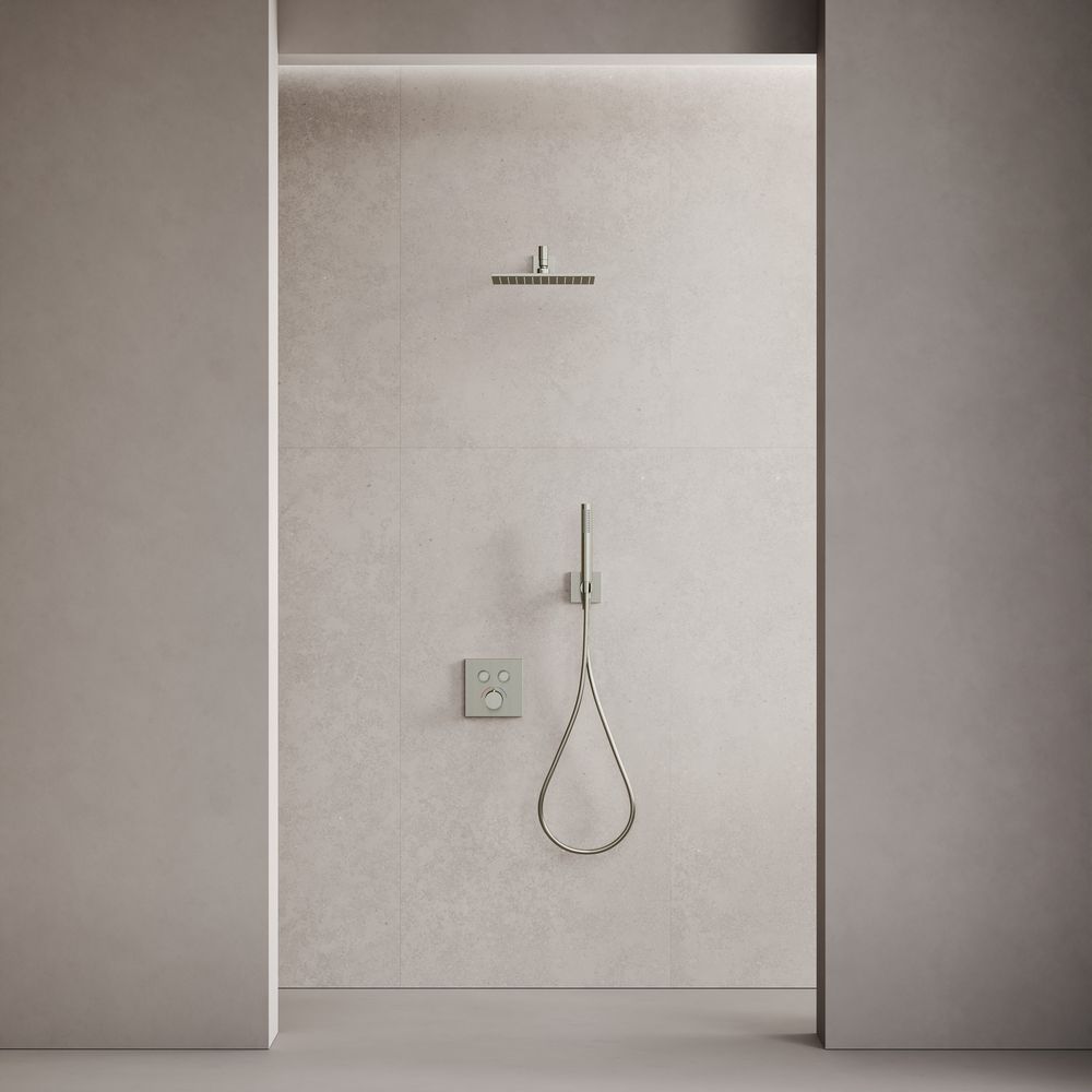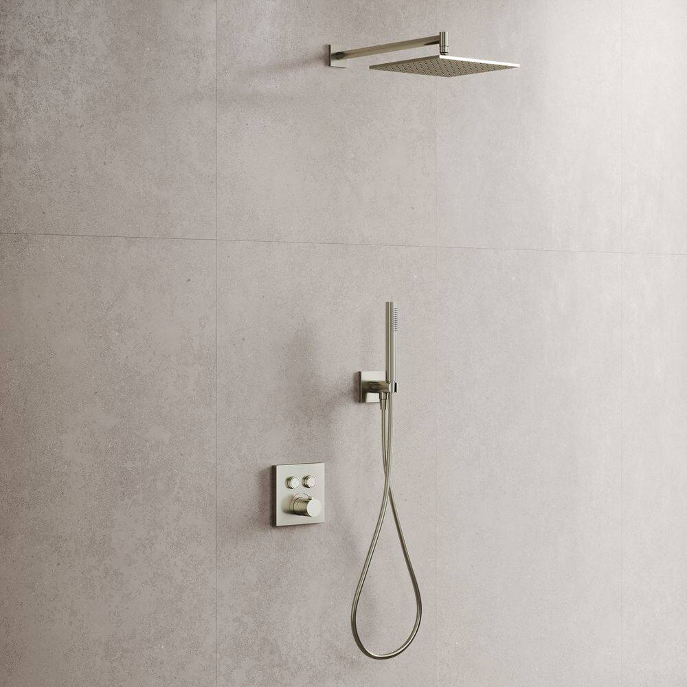 Душевой комплект с термостатом SC9022BN Sancos Linn с внутренней частью Брашированный никель/Италия: смеситель скрытого монтажа со встроенным термостатом. Надежный корпус из высококачественной латуни! Термостатический картридж SEDAL — обеспечивает точную настройку заданной температуры. Встроенный девиатор автоматически переклюключает поток с верхнего душа на ручной при выключении воды. Ручной душ из латуни! Шланг ПВХ с системой защиты от перекручивания, длина 1,5 м.. Верхний душ из нержавеюшей стали , квадрат 250*250 мм, с возможностью регулировки угла наклона. Экстрапрочное PVD покрытие!!! Цвет — брашированный никель. Поверхность — матовая.