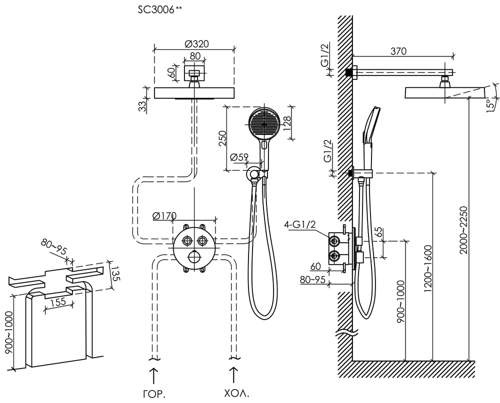 Вылет верхнего душа — 370 мм