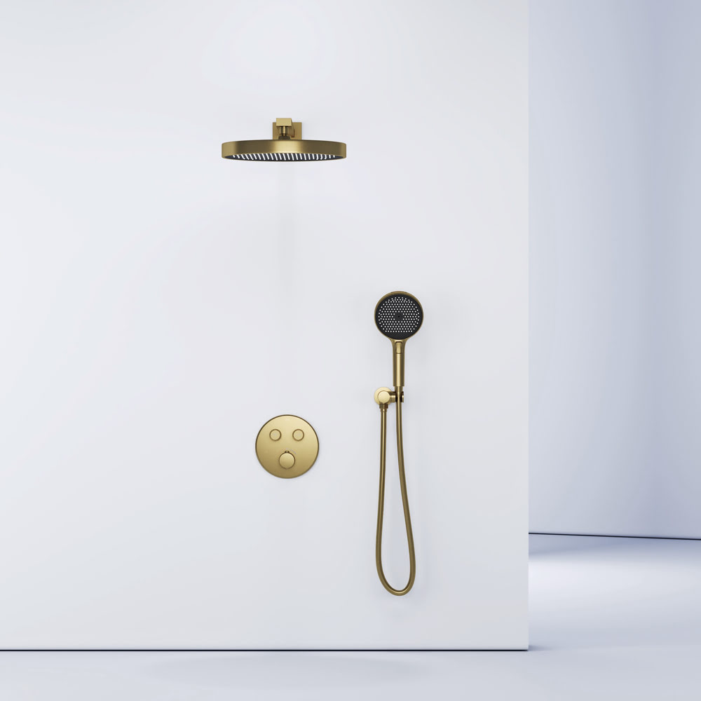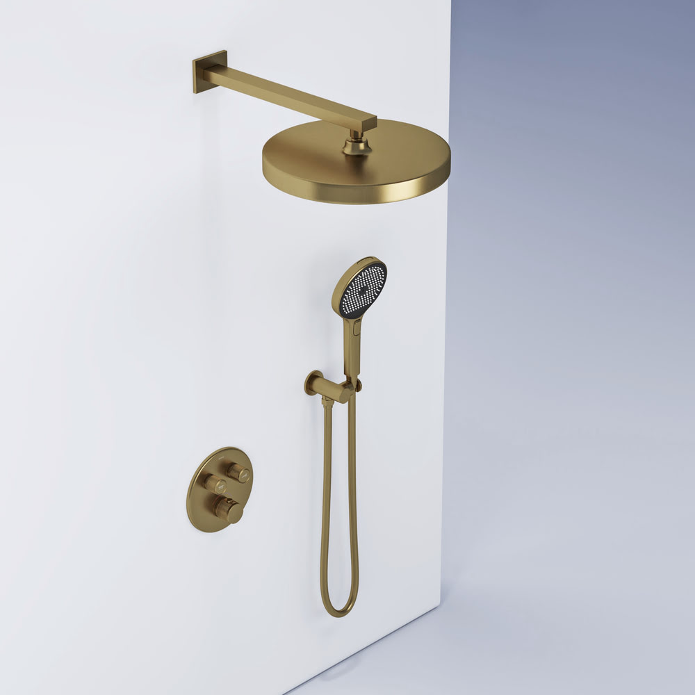 Душевой комплект SANCOS Space SC3006BG встраиваемый для душа с термостатическим смесителем/Италия: — встраиваемая душевая система с функцией обогащения воды воздухом. Полный комплект для установки. Встраиваемый термостатический смеситель с внутренним блоком в комплекте. Удобное кнопочное управление между источниками воды. Базовая настройка температуры воды — 40 градусов. Возможность регулировки потока воды для каждого источника. Верхний тропический душ с регулировкой наклона потока воды. Многофункциональный ручной душ — 4 режима пока воды, диаметр лейки — 130 мм, кнопкадля переключения между режимами. Гибкий шланг с защитой от перекручивания в комплекте. Цвет — брашированное золото. Надежное покрытие методом PVD (Процесс PVD состоит в покрытии всей металлической поверхности тонким слоем различных металлов (титан, алюминий, вольфрам, молибден, железо, никель, медь, графит, хром), и их сплавов, очень плотных и исключительно прочных металлосодержащих соединений).
