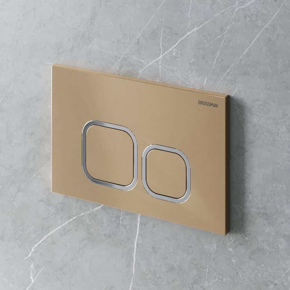 Клавиша смыва золото матовый Grossman Cosmo 700.K31.02.310.310 /Германия: имеет механический двухрежимный тип слива. Обладает прекрасным внешним видом, поскольку в современных санузлах каждая деталь должна гармонировать с интерьером и соответствовать стилю помещения. Выполнена из ABS-пластика. Клавиша совместима с Инсталляция для подвесного унитаза Grossman 900.K31.01.000