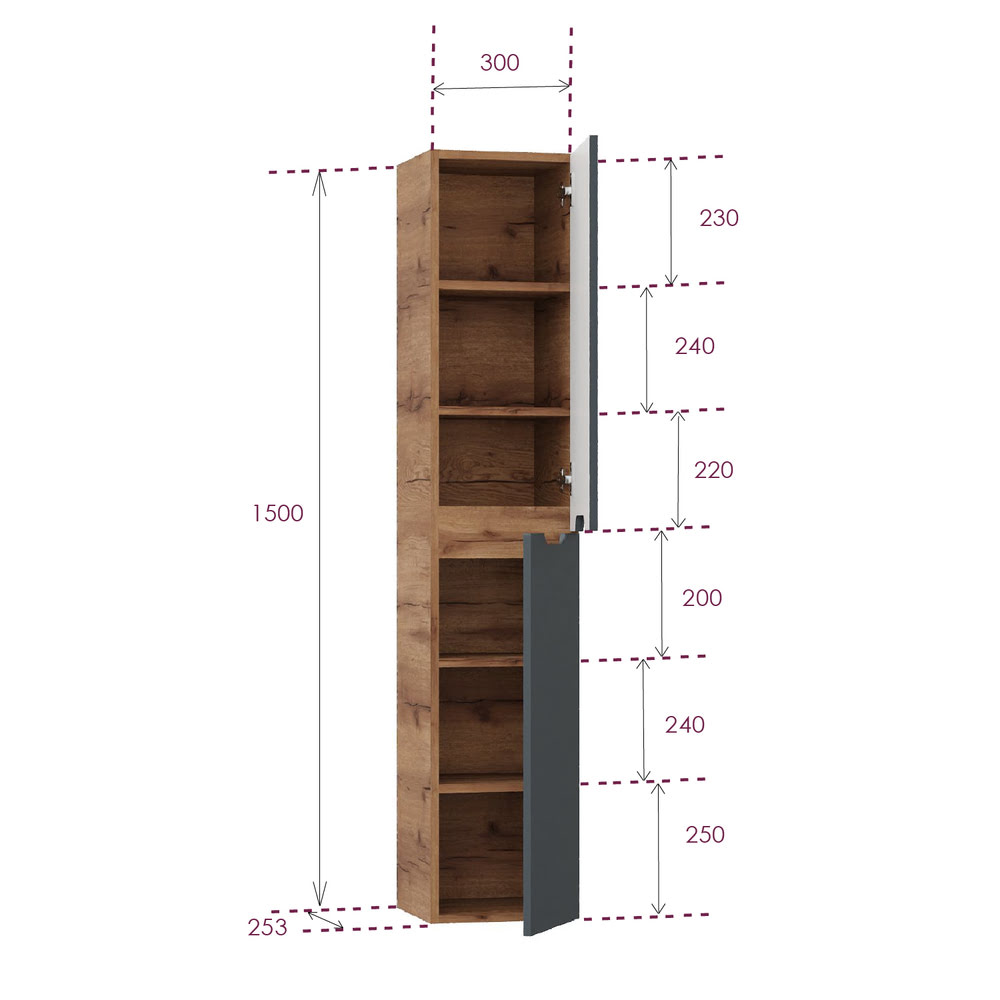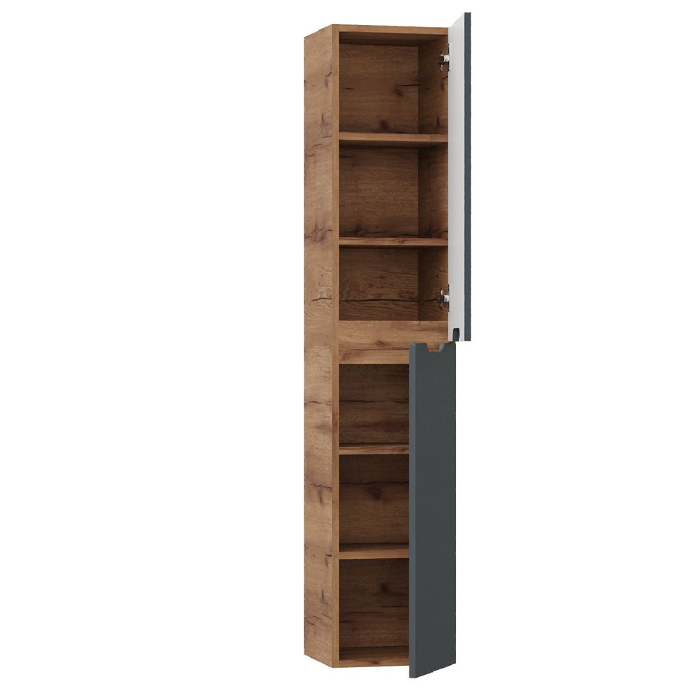 Пенал 30 см Айленд подвесной Графит/дуб крафт золотой Универсальный: — сочетает в себе стильный минималистичный дизайн, высочайшее качество исполнения и актуальные тренды цвета: графит и дуб крафт золотой. Пенал имеет два отделения за распашными дверцами с доводчиками, полки внутри регулируются по высоте. Внутреннее пространство пенала поделено полками на 3 секции, что позволяет удобно размещать косметические средства, гигиенические принадлежности и мелкие аксессуары. Ручки, изящно интегрированные в фасады, позволяют сделать эксплуатацию мебели более удобной и практичной. Пенал 30 см Айленд подвесной Графит/дуб крафт золотой Универсальный имеет универсальную ориентацию: при установке верх и низ пенала можно менять местами, а дверцы могут открываться как влево, так и вправо.