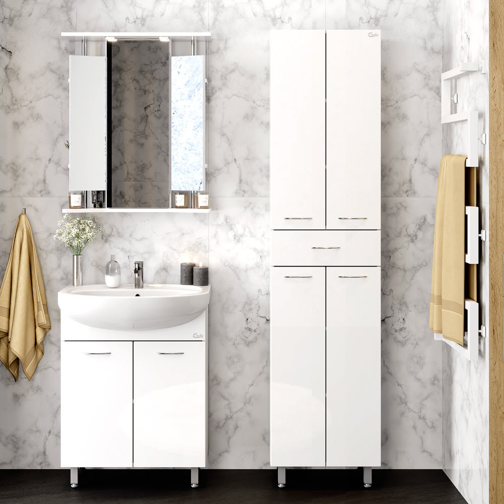 Пенал 46 см МОДЕРН с корзиной для белья: для ванной комнаты. Материал корпуса — влагостойкое ЛДСП (EGGER, Германия). Фасад — из влагостойкого МДФ, покрытого методом вакуумного прессования глянцевой пленкой KRONOSPAN (Германия). Цвет — белый. Монтаж Пенал 46 см МОДЕРН с корзиной для белья — напольный.