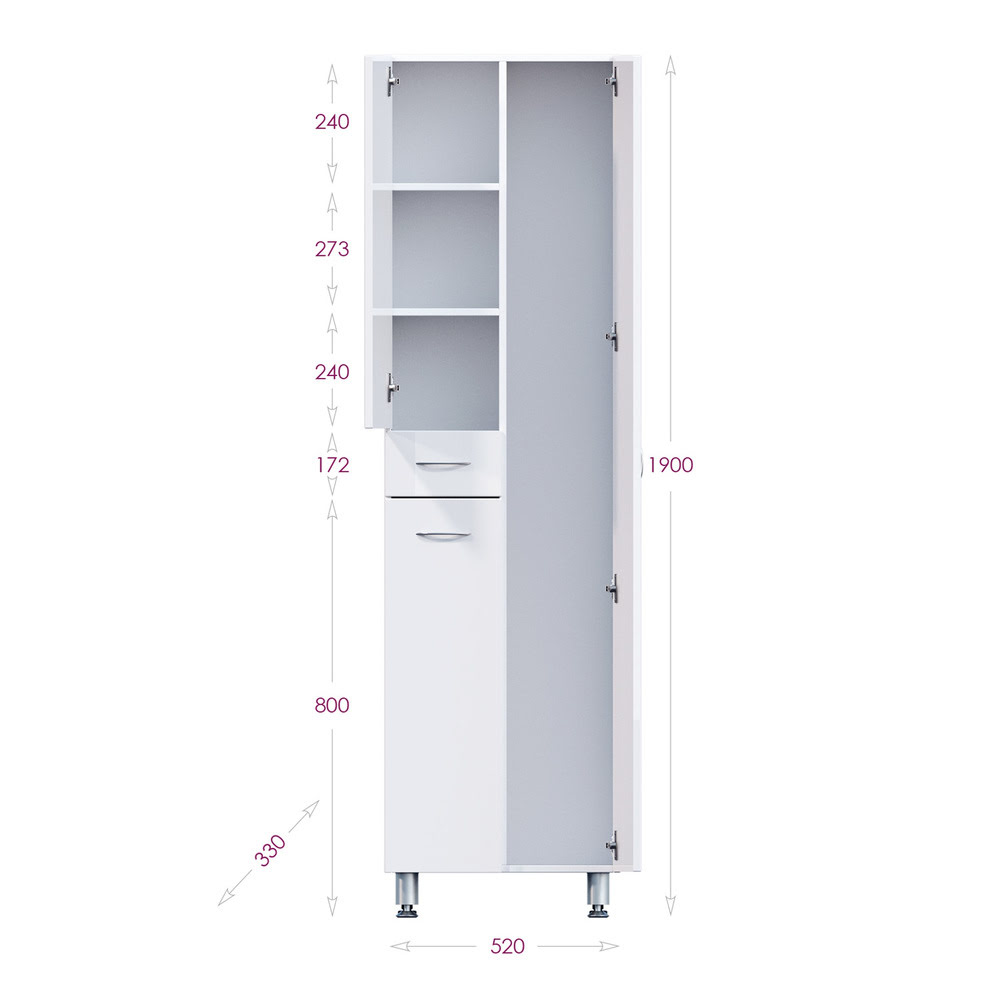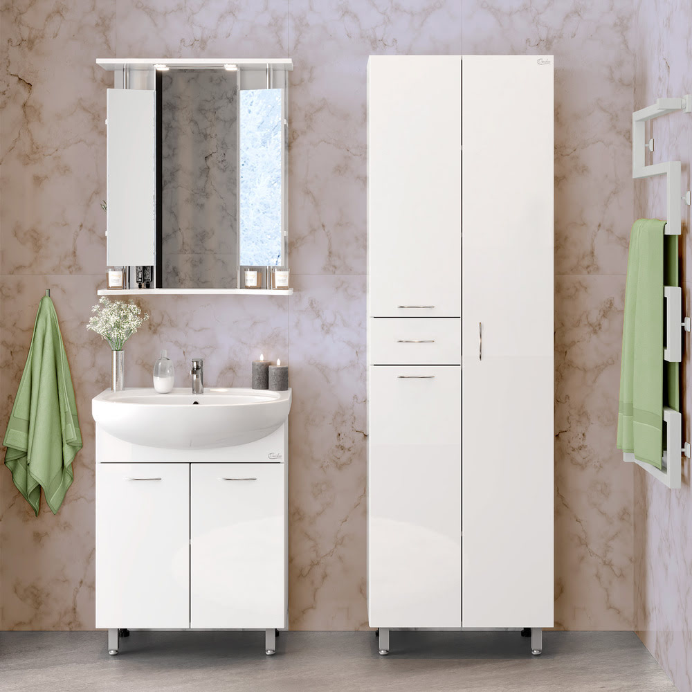 Пенал 52 см МОДЕРН с корзиной Правый: для ванной комнаты: двухстворчатый. Наполнение — справа распашной большой шкафчик с крючком для двух халатов, слева вверху распашной шкафчик с двумя полочками, внизу — ящик с корзиной для белья, а между ними ящик полного выдвижения. Комплектация: фурнитура металл хром, петли с доводчиком (при закрытии не слышен раздражающий стук), 4 регулируемых ножки, комплект креплений к стене. В состав поставки так же входит инструкция по монтажу и гарантийный талон. Материал корпуса — влагостойкое ЛДСП (EGGER, Германия). Фасад — из влагостойкого МДФ, покрытого методом вакуумного прессования глянцевой пленкой KRONOSPAN (Германия). Цвет — белый. Монтаж Пенал 52 см МОДЕРН с корзиной Правый — напольный.