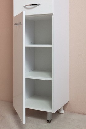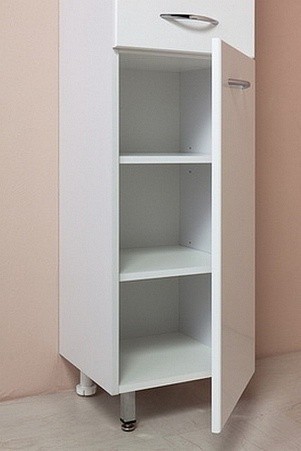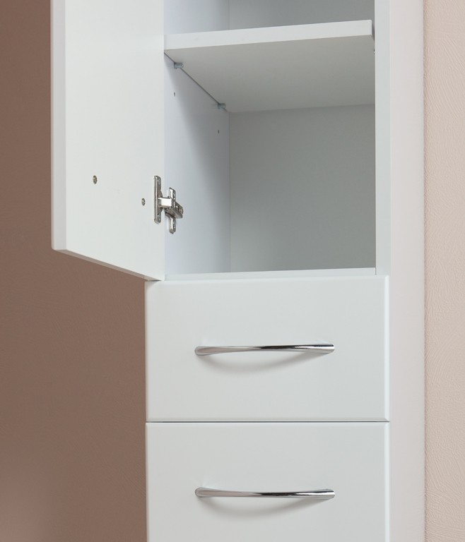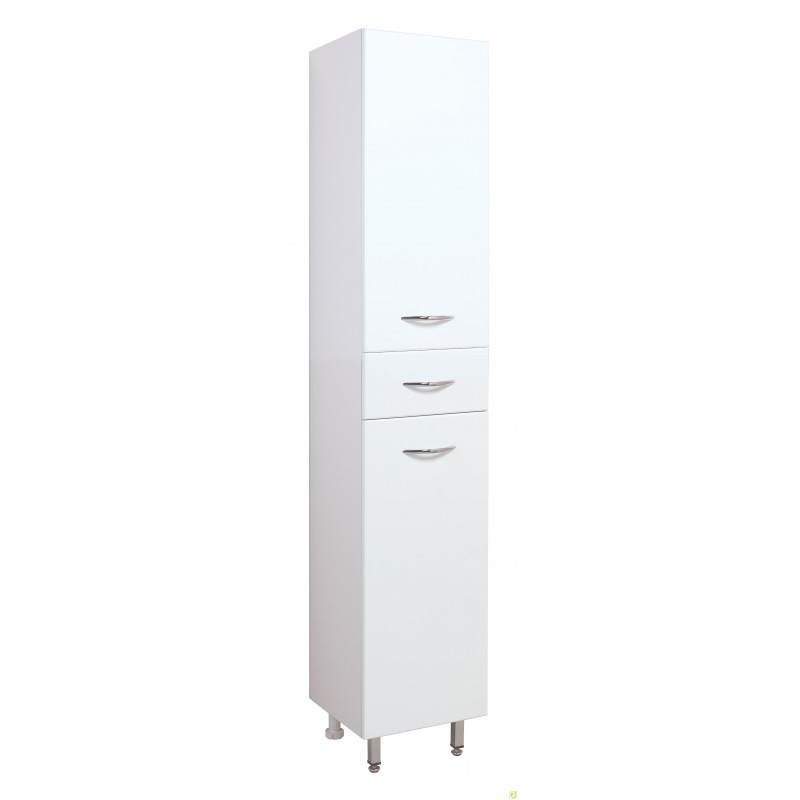 Пенал МОДЕРН 32 см для ванной комнаты: УНИВЕРСАЛЕН (по ВАШЕМУ желанию петли могут быть справа либо слева). Наполнение — вверху и внизу: распашной большой шкафчик с полочками (2 штуки в каждом) и ящик полного выдвижения, расположенным между ними. Комплектация: фурнитура металл хром, петли с доводчиком (при закрытии не слышен раздражающий стук), 4 регулируемых ножки, комплект креплений к стене. В состав поставки так же входит инструкция по монтажу и гарантийный талон. Материал корпуса — влагостойкое ЛДСП (EGGER, Германия). Фасад — из влагостойкого МДФ, покрытого методом вакуумного прессования глянцевой пленкой KRONOSPAN (Германия). Цвет — белый. Монтаж — напольный.