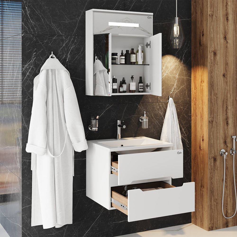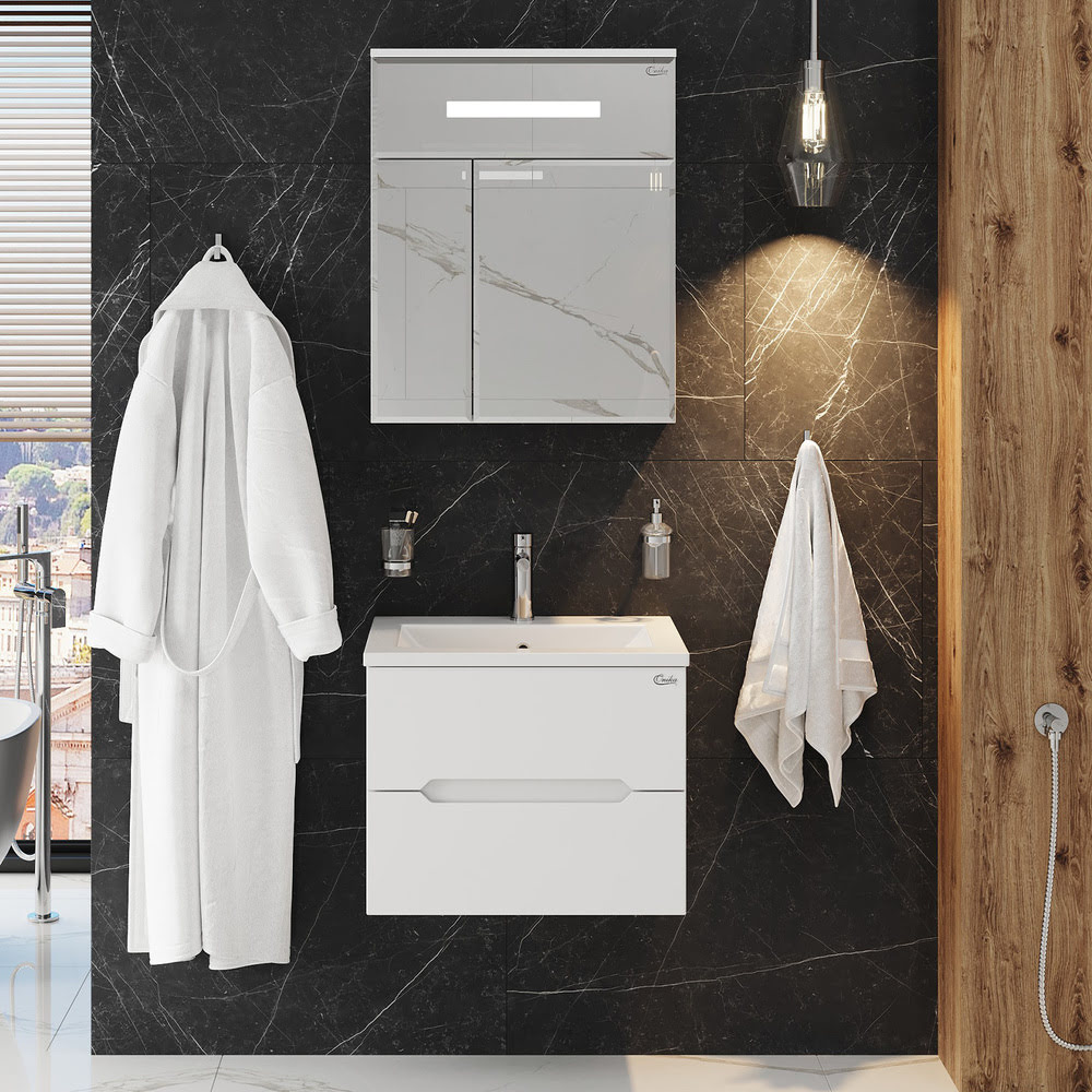 Шкаф-зеркало СИГМА 60 см — олицетворение минимализма и отражение хорошего вкуса обладателя. Внешне это отражается в лаконичной прямоугольной форме без ручек и лишнего декора и стильной подсветке, в функционально — в двух дверцах разного размера с механизмом плавного закрывания, скрывающих просторное пространство для хранения необходимых вещей, разделенное на 2 части стеклянной полочкой с еврокромкой. Зеркальное полотно создано на основе серебряной амальгамы, которая обеспечивает качественное изображение, влагостойкость и долгий срок эксплуатации. В зеркале предусмотрена светодиодная подсветка, дающая рассеянный свет и комфорт использования. Количество ламп — 1, мощность лампы — 5 Вт, световая температура — 6500 К, тип выключателя — механический. Шкаф-зеркало выполнен из ЛДСП, устойчивой к механическим воздействиям, перепадам температур и высокой влажности. Подвесы для крепления шкафа к стене — в комплекте.