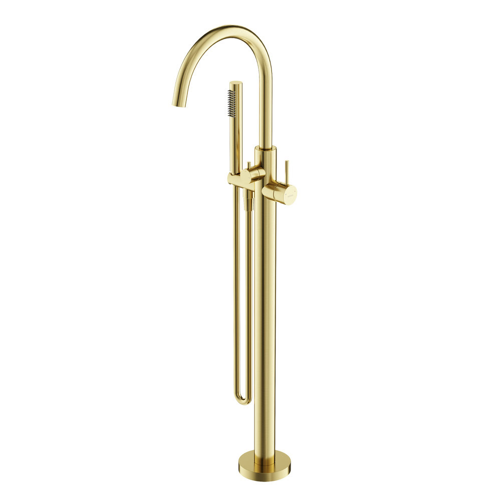 Смеситель для ванны напольный SC9009BG SANCOS Etna брашированное золото/Италия: смеситель для ванны напольного монтажа. Надежный корпус из высококачественной латуни. Поворотный излив. Картридж CITEC — обеспечивает точную настройку температуры и плавное управление напором. Аэратор Neoperl смягчяет воду и препятствует разбрызгиванию. Встроенный девиатор автоматически переключает поток с душа на излив при закрытии воды. Ручной душ из латуни!!! Шланг ПВХ с функцией антискручивания, длиной 1,25 м.. Экстропрочное покрытие PVD!!! Цвет — брашированное золото. Поверхность — матовая.