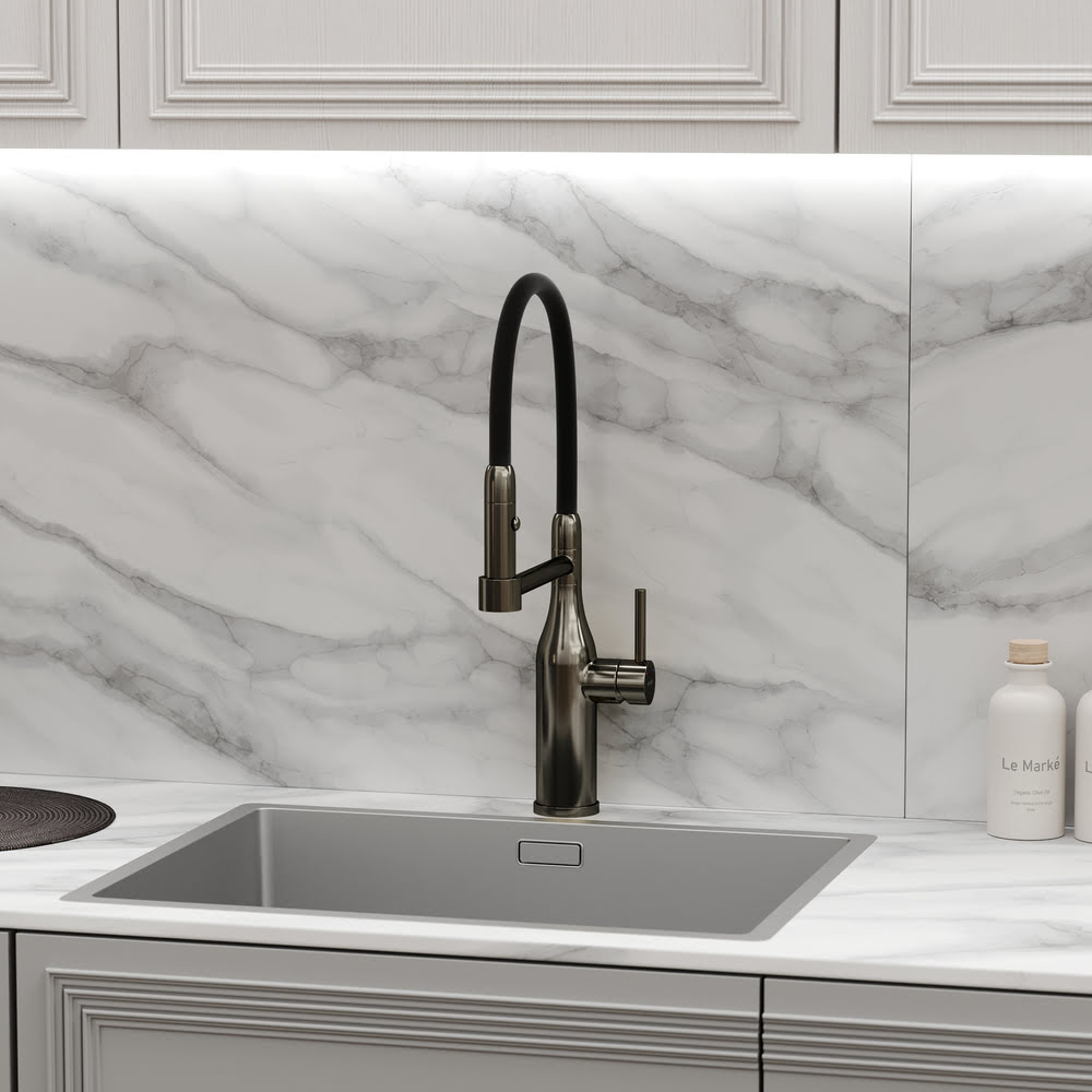 Смеситель SANCOS Pride SC4011GG с гибким изливом/Италия: с гибким изливом, с возможностью регулировки температуры воды, материал — латунь/силикон, цвет вороненая сталь/черный, поверхность — брашированная, подводка гибкая — 1/2″ 500 мм.. Оснащение: аэратор, гибкая подводка, ключ и крепления для монтажа, ключ для обслуживания аэратора. Гарантия на водозапорные механизмы — 5 лет! Гарантия на корпус — 10 лет!
