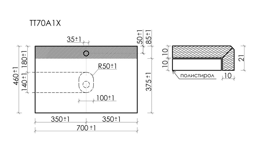 Столешница для ванной комнаты Sancos TT70A1X 700х460 мм с отверстием под смеситель