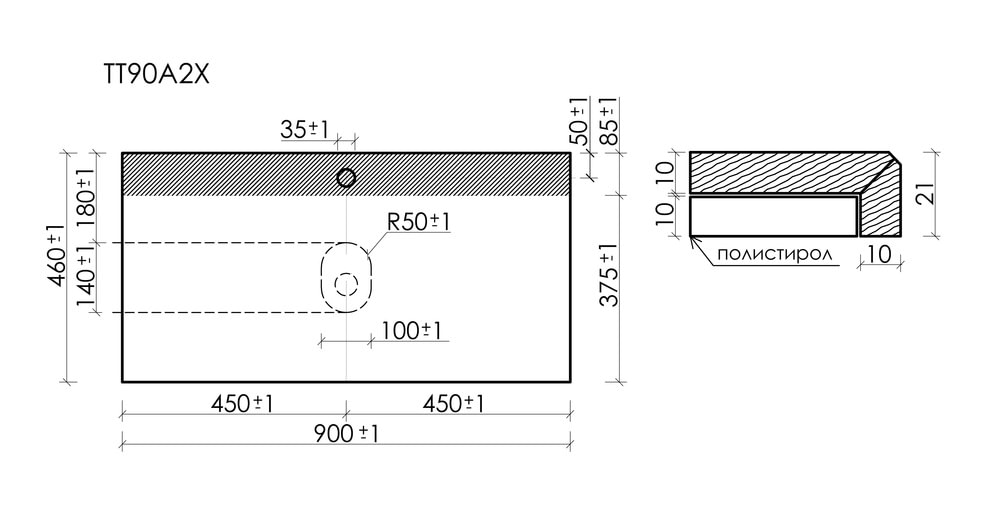 Столешница для ванной комнаты Sancos TT90A2X 900х460 мм с отверстием под смеситель: