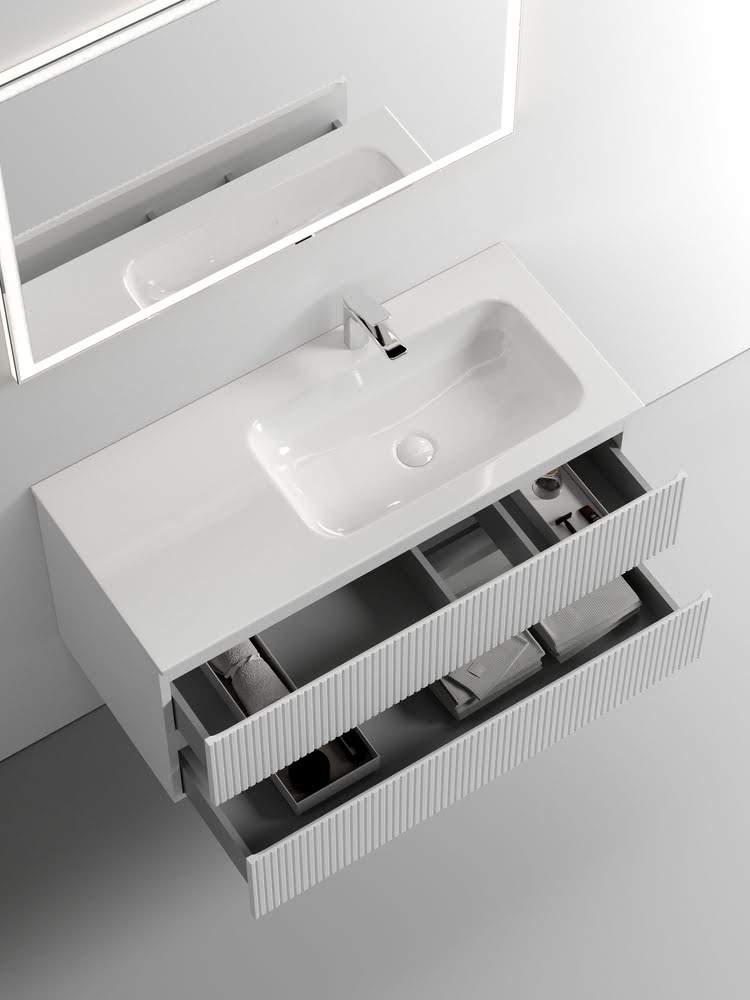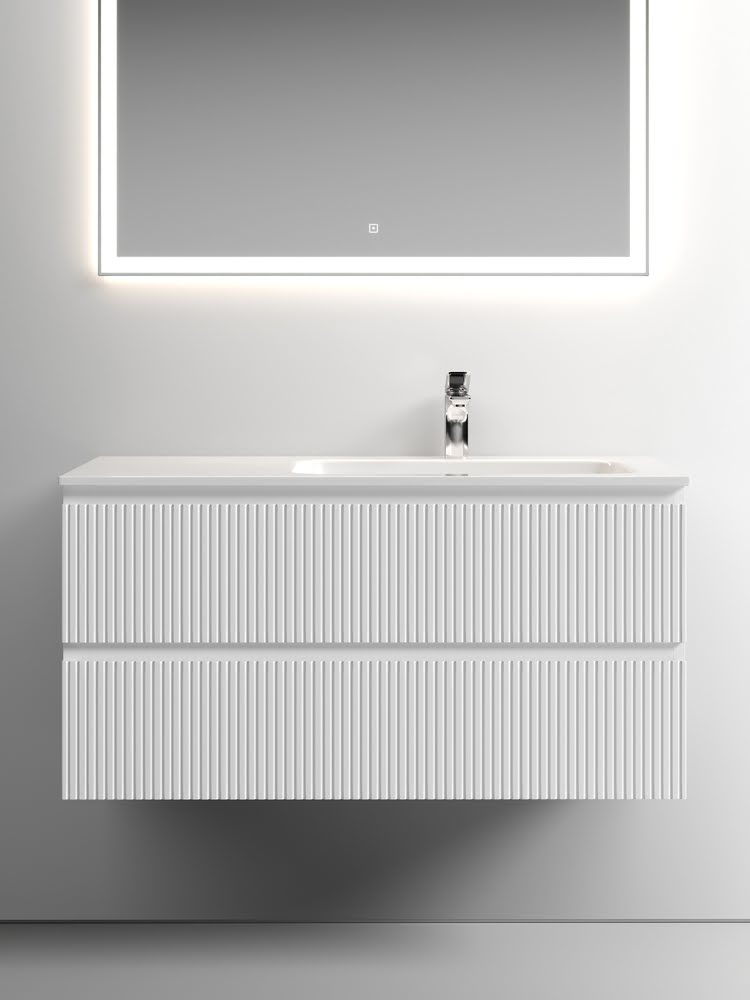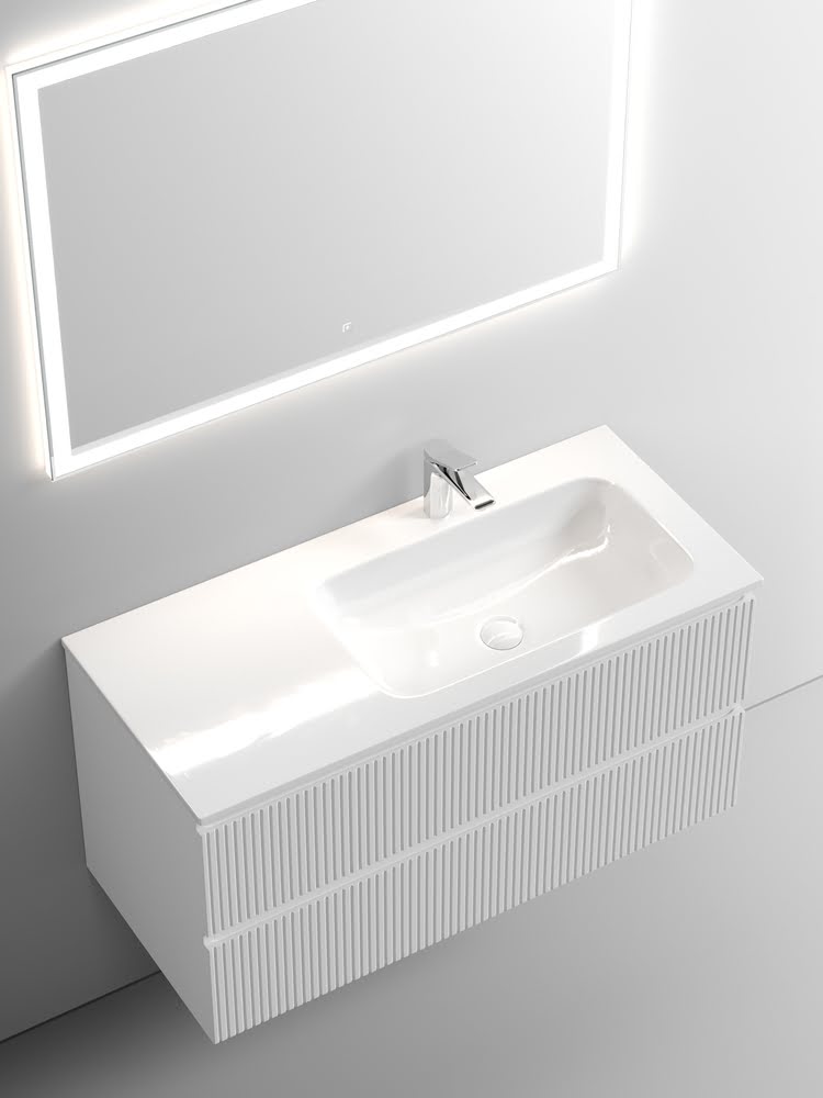 Тумба 100 см SNOB T Bianco Правая ПОДВЕСНАЯ Sancos с умывальником CN7015 — c двумя ящиками оснащенными доводчиками скрытого монтажа с системой Soft close (плавного закрывания), цвет Bianco. Корпус и фасад тумбы изготовлен из влагостойкого МДФ, покрытого матовой плёнкой ПВХ. Комплектуется умывальником CN7015. Размеры умывальника: ширина — 1010 мм, глубина — 457 мм, высота — 137 мм. Монтаж тумбы — подвесной. ВНИМАНИЕ: Тумба 100 см SNOB T ПОДВЕСНАЯ Sancos ТАКЖЕ СОВМЕСТИМА с умывальниками — CN7015MB / CN7003R
