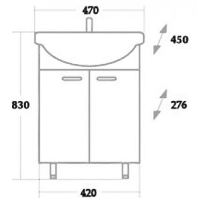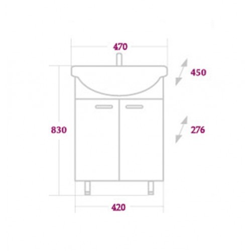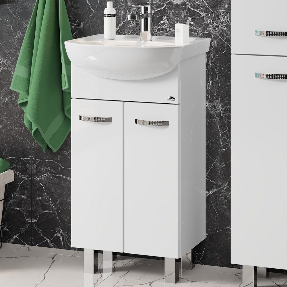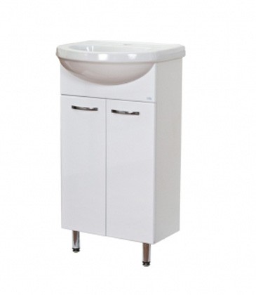 Совместимые раковины — Оскольская керамика Дора 47 / Santek Азов 45. Комплектуется умывальником Дора-47. Размеры умывальника: ширина — 470 мм, глубина — 375 мм. Все компоненты имеют специальное исполнение, обеспечивающее безопасную работу в условиях повышенной влажности. Петли с доводчиком (BOYARD). Ручки хром, регулируемые металлические опоры (BOYARD). Способ установки — напольный.