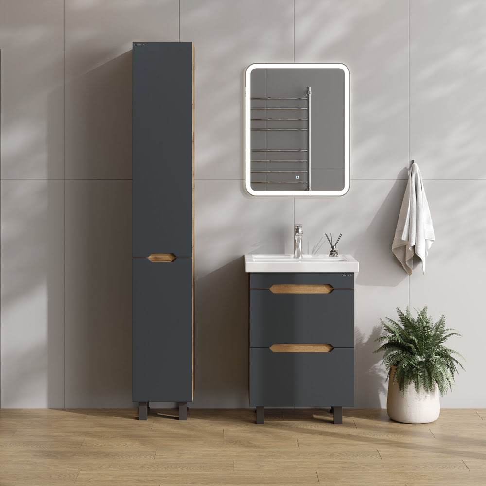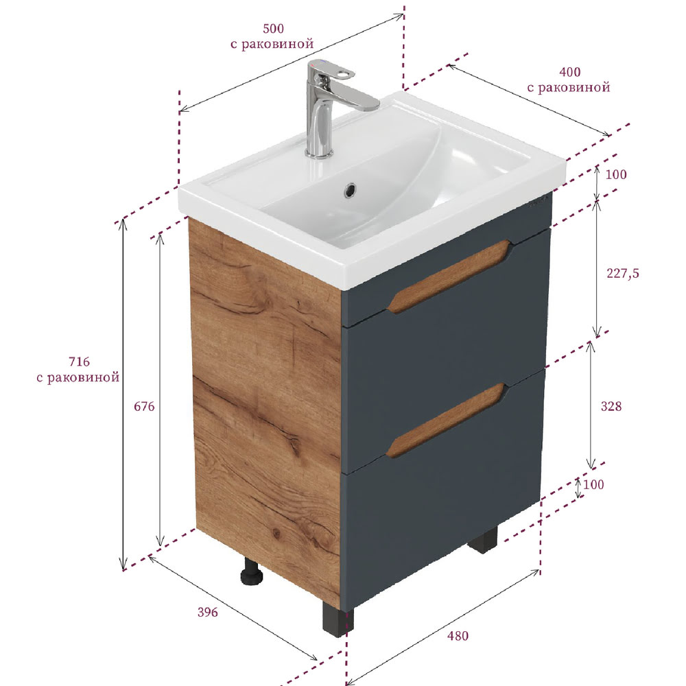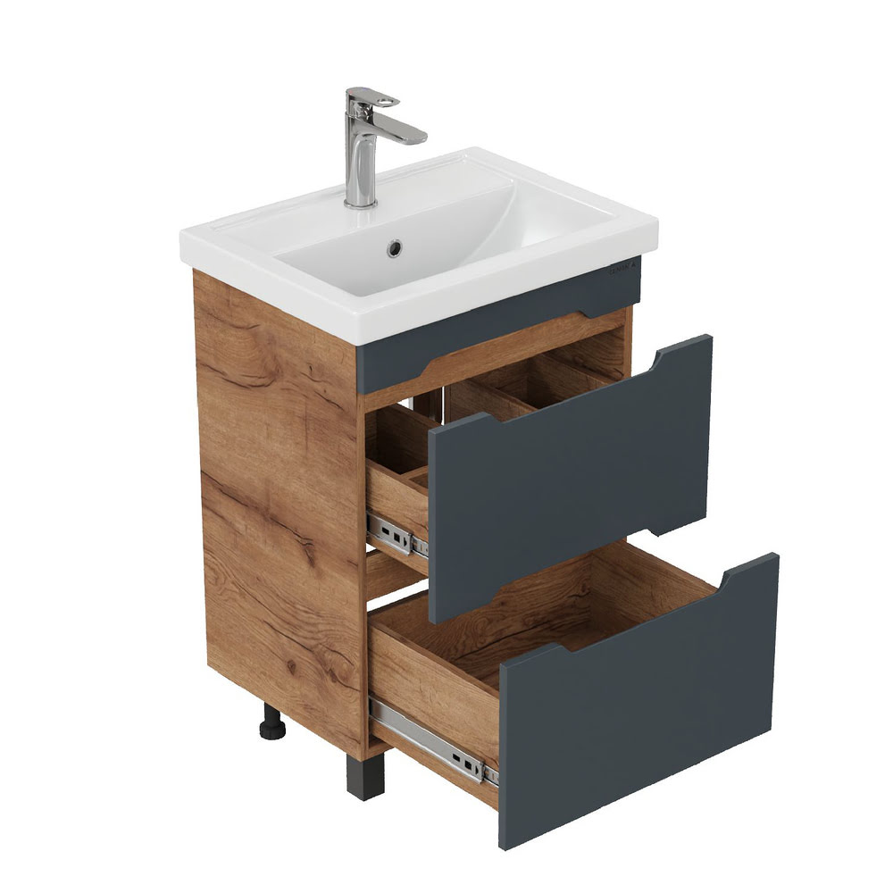 Тумба 50 см Айленд напольная Графит/дуб крафт золотой с умывальником Фостер-50: объединяет в себе элегантный минималистичный стиль, актуальный дизайн и высшее качество выполнения. Тумба впишется в любой интерьер благодаря трендовому сочетанию матового графита и золотого дуба, а также поможет эффективно организовать пространство, что особенно важно в небольших ванных комнатах. В её конструкции предусмотрены два ящика, оснащенных направляющими полного выдвижения: нижний ящик подходит для хранения крупных предметов, а верхний, оборудованный практичной системой организации, вмещает мелкие аксессуары. Интегрированные в фасады ручки обеспечивают удобство и функциональность в использовании. Корпус Тумба 50 см Айленд напольная Графит/дуб крафт золотой с умывальником Фостер-50 изготовлен из ЛДСП, а фасады ящиков сделаны из ЛМДФ под пленкой, что придаёт им стойкость к механическим повреждениям, изменениям температуры и высокому уровню влажности. Ножки (2 декоративных и 2 пластиковых) идут в комплекте с тумбой. Размеры тумбы без учета раковины и ножек 47х38х66 см. Совместимая раковина — Фостер-50 (Кirovit).