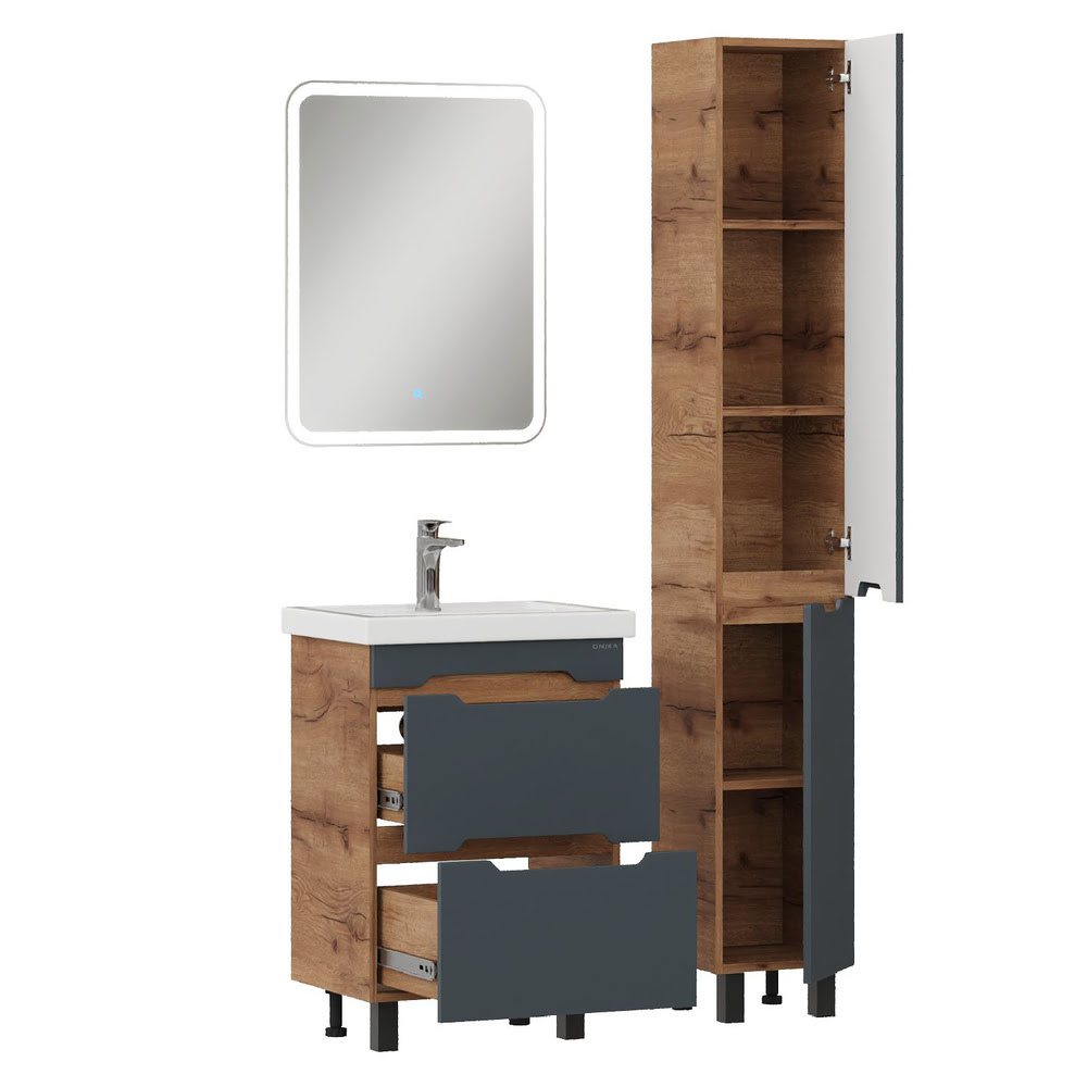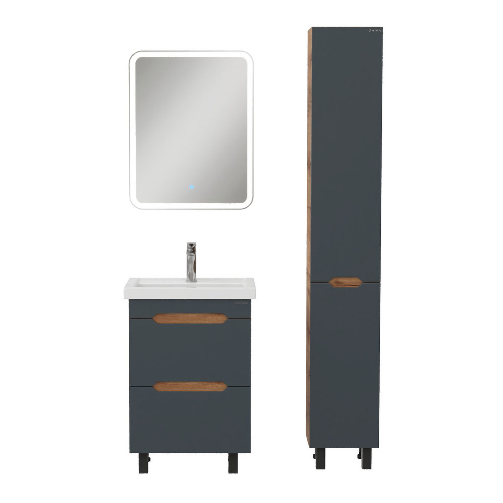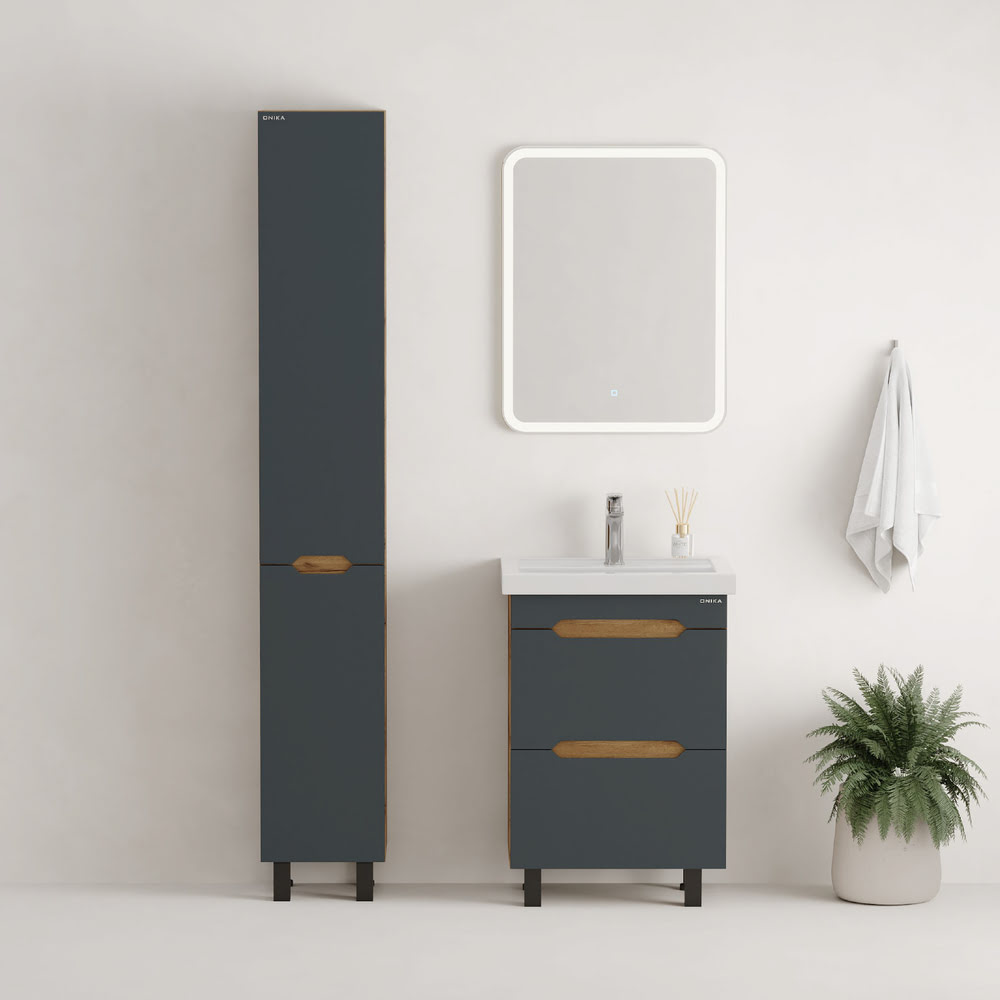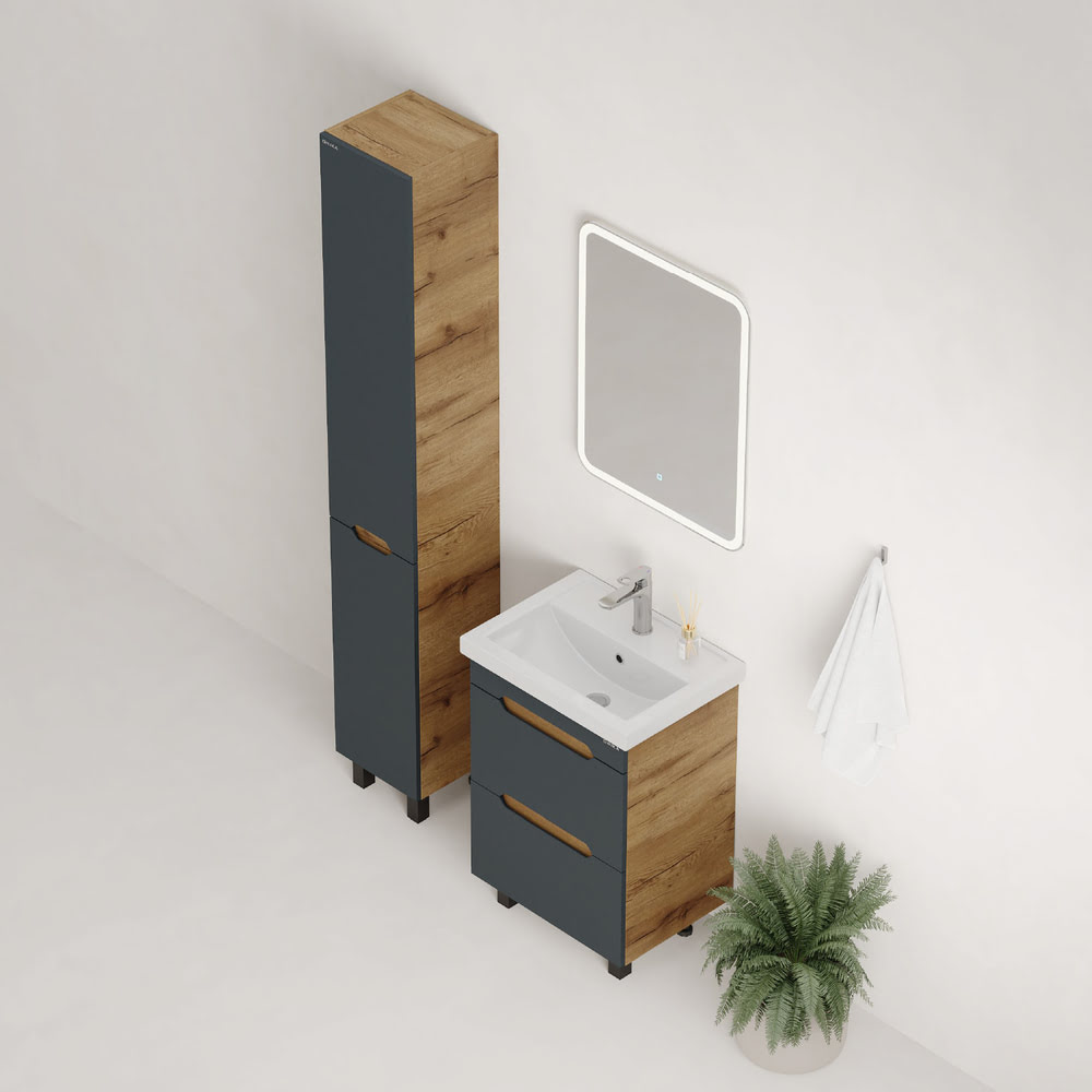 Тумба 50 см Айленд напольная Графит/дуб крафт золотой с умывальником Фостер-50: объединяет в себе элегантный минималистичный стиль, актуальный дизайн и высшее качество выполнения. Тумба впишется в любой интерьер благодаря трендовому сочетанию матового графита и золотого дуба, а также поможет эффективно организовать пространство, что особенно важно в небольших ванных комнатах. В её конструкции предусмотрены два ящика, оснащенных направляющими полного выдвижения: нижний ящик подходит для хранения крупных предметов, а верхний, оборудованный практичной системой организации, вмещает мелкие аксессуары. Интегрированные в фасады ручки обеспечивают удобство и функциональность в использовании. Корпус Тумба 50 см Айленд напольная Графит/дуб крафт золотой с умывальником Фостер-50 изготовлен из ЛДСП, а фасады ящиков сделаны из ЛМДФ под пленкой, что придаёт им стойкость к механическим повреждениям, изменениям температуры и высокому уровню влажности. Ножки (2 декоративных и 2 пластиковых) идут в комплекте с тумбой. Размеры тумбы без учета раковины и ножек 47х38х66 см. Совместимая раковина — Фостер-50 (Кirovit).