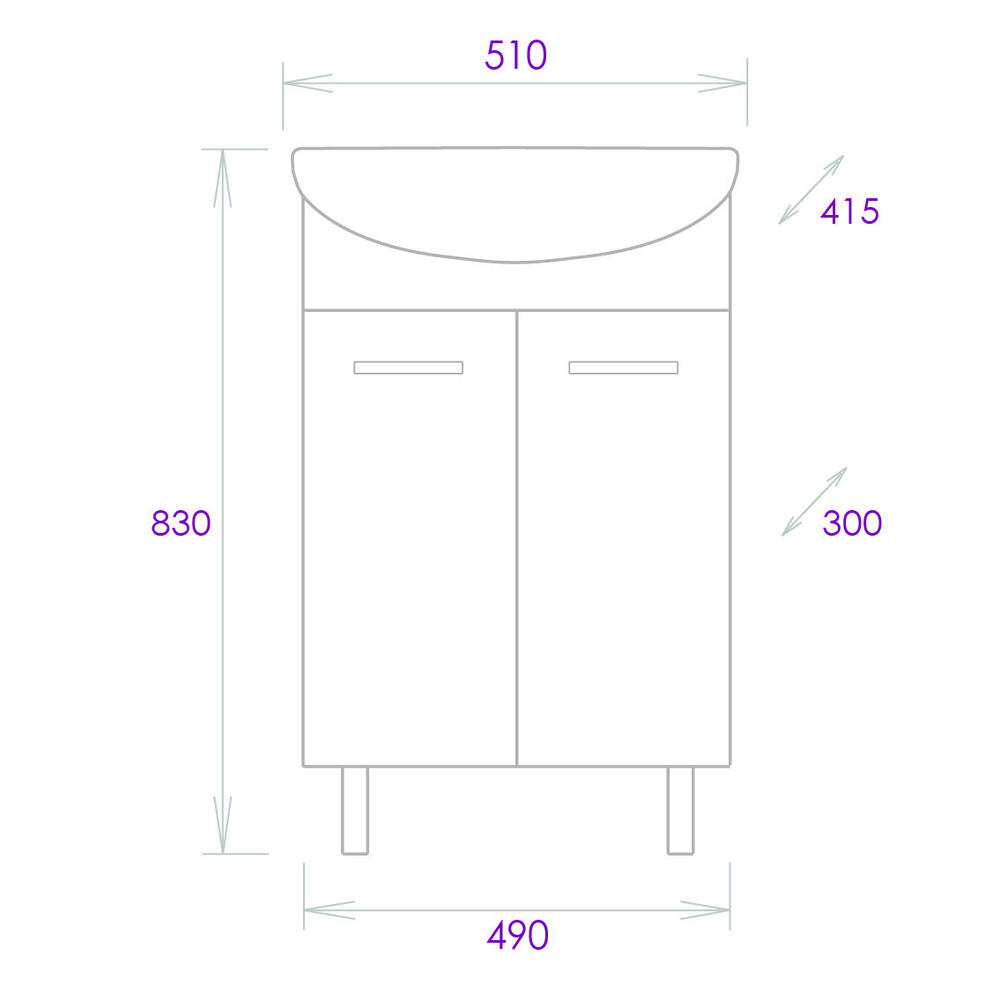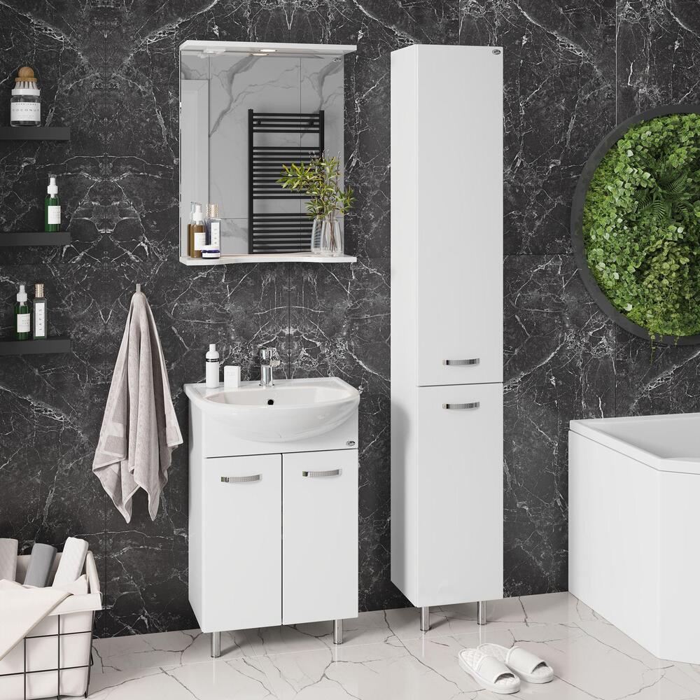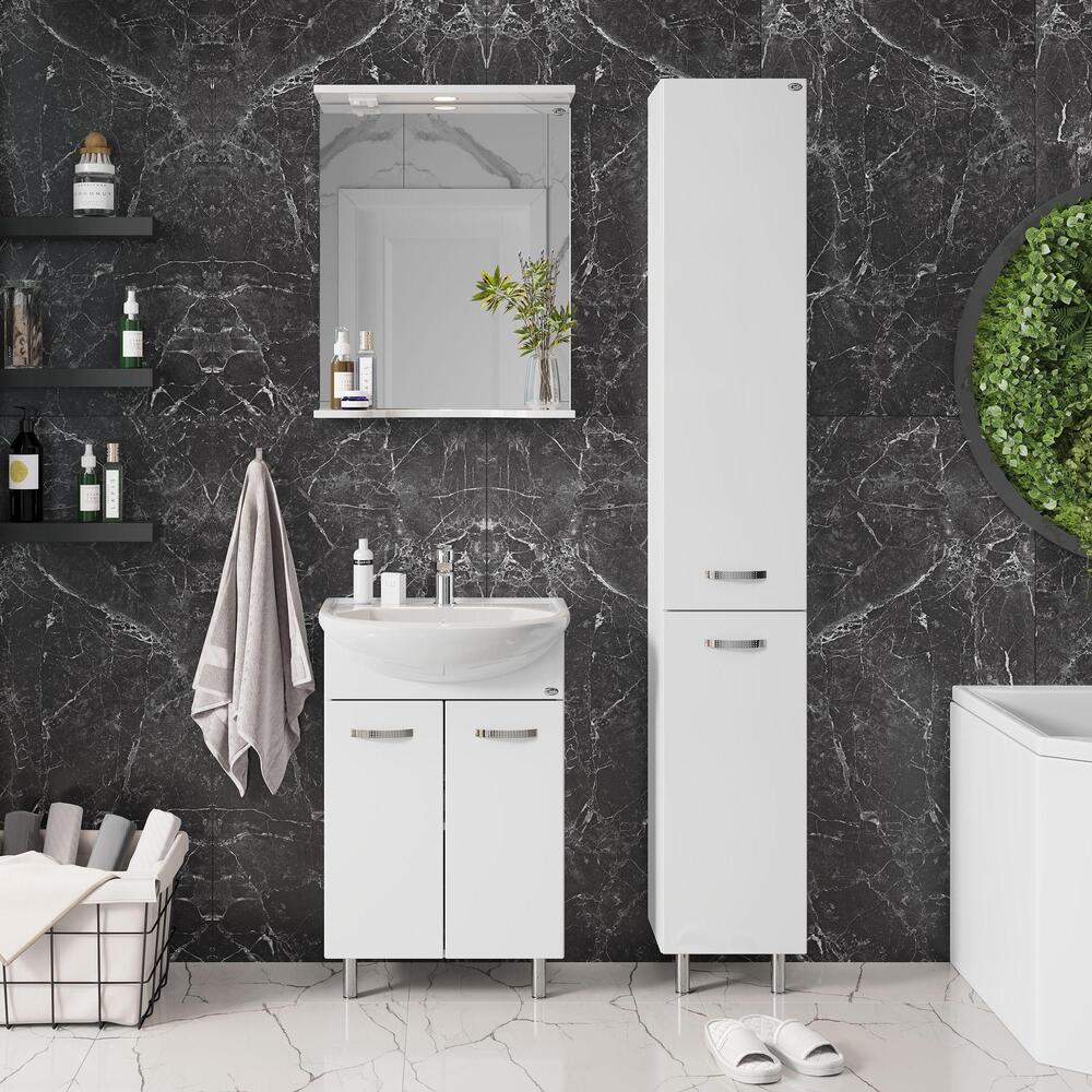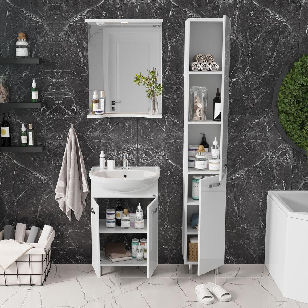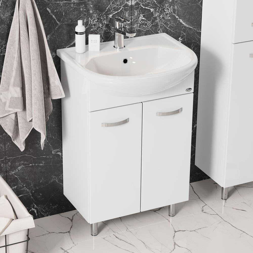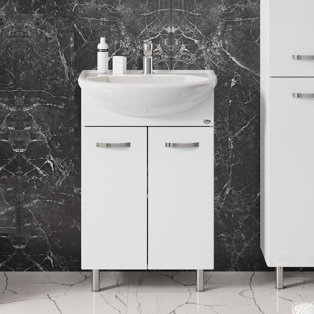 Тумба 50 см КОРАЛЛ с умывальником для ванной комнаты: наполнение — двухдверный распашной ящик с полочкой. Корпус выполнен из влагостойкого ЛДСП EGGER. Фасад — фрезерованный, шлифованный из влагостойкого МДФ с покрытием — глянцевая пленка. Комплектуется умывальником Уют-50 (Rosa). Размеры умывальника: ширина — 510 мм, глубина — 415 мм. Все компоненты имеют специальное исполнение, обеспечивающее безопасную работу в условиях повышенной влажности. Петли с доводчиком (BOYARD). Ручки хром, регулируемые металлические опоры (BOYARD). Способ установки — напольный.