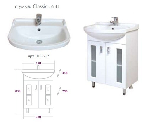 Тумба 55 см КРИСТАЛЛ напольная белая с умывальником Балтика-55 :