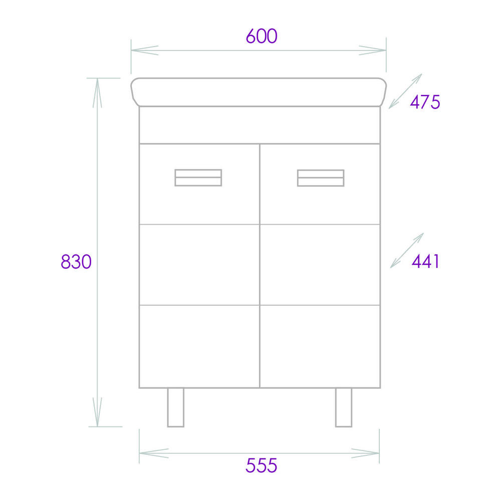 Ручки врезаны в фасады. 4 ножки (2 декоративных и 2 пластиковых) с регулировкой по высоте идут в комплекте с тумбой. Размеры тумбы без учета раковины и ножек: 55x44x67 см. Монтаж — напольный.