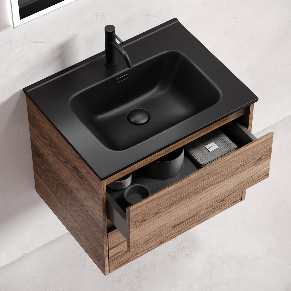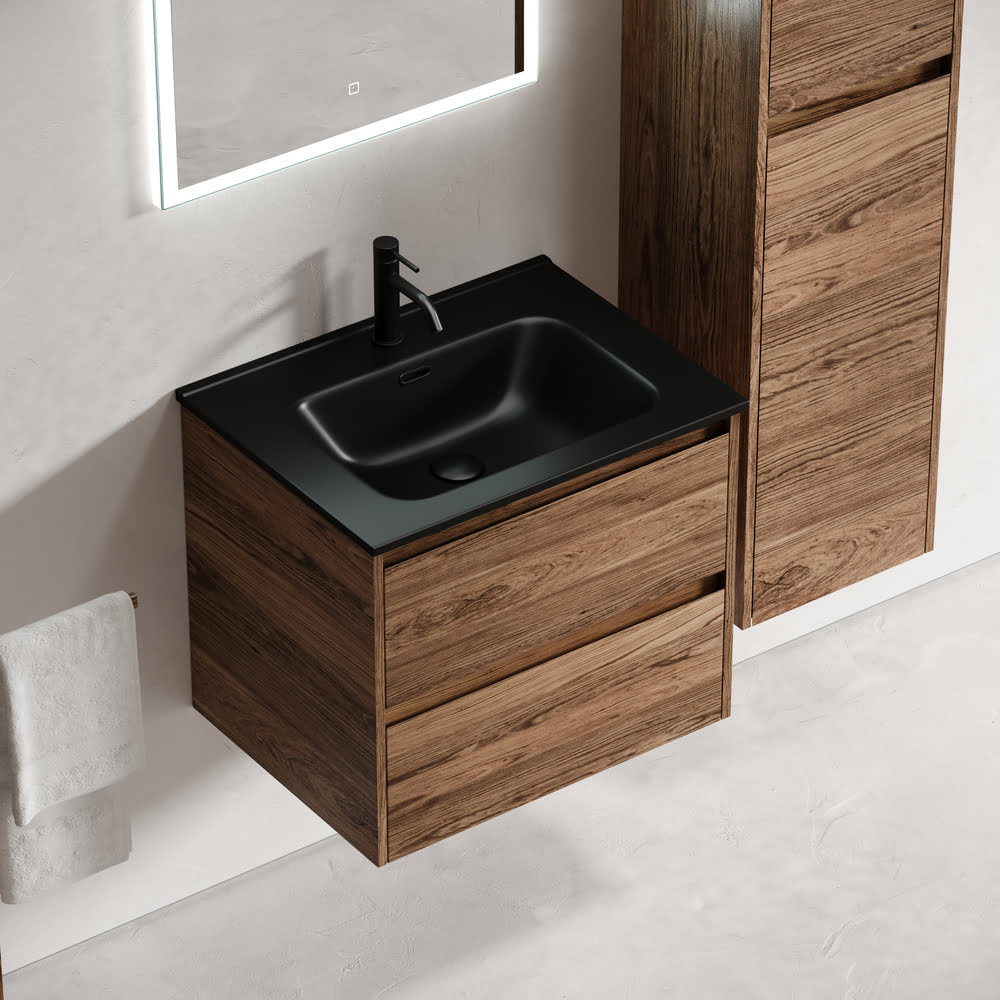 Тумба 60 см Libra ПОДВЕСНАЯ Sancos Дуб чарльстон с умывальником CN7001MB — c двумя ящиками оснащенными доводчиками скрытого монтажа с системой Soft close (плавного закрывания), c фрезерованными ручками по всей длине фасада, цвет — Дуб чарльстон!!! Материал — ЛДСП!!! Комплектуется умывальником ЧЁРНОГО МАТОВОГО цвета CN7001MB.  Размеры умывальника: ширина — 610 мм, глубина — 465 мм, высота — 180 мм.  Монтаж тумбы — подвесной. ВНИМАНИЕ: Тумба 60 см Libra ПОДВЕСНАЯ Sancos ТАКЖЕ СОВМЕСТИМА с умывальниками — CN7001 / СN7011 / CN7011MB / CN7011wx / CN7011MBwx