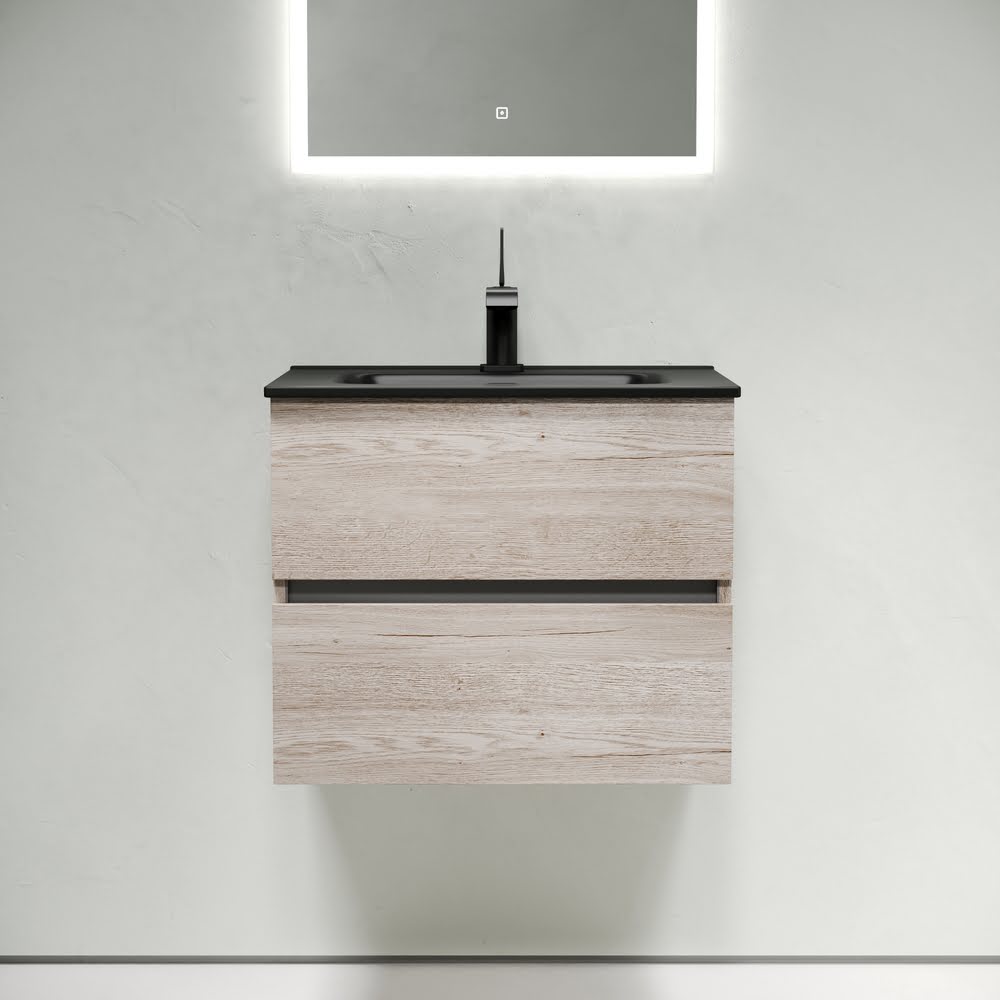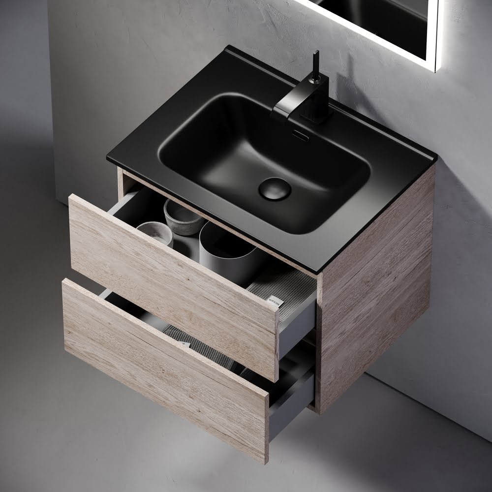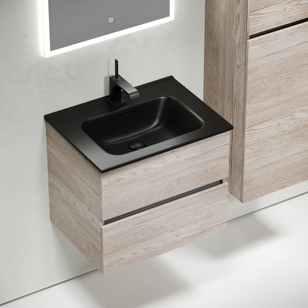 Тумба 60 см Urban ПОДВЕСНАЯ Sancos Дуб галифакс натуральный с умывальником CN7001MB — c двумя ящиками оснащенными доводчиками скрытого монтажа с системой Soft close (плавного закрывания), c ручкой Gola (специальной скрытой ручкой, которая прикрепляется непосредственно на торцевой части фасада, но за которую можно держаться, при открытии и закрытии шкафчиков) по всей длине тумбы, Дуб галифакс натуральный, материал ЛДСП. Комплектуется умывальником ЧЁРНОГО МАТОВОГО цвета CN7001MB. Размеры умывальника: ширина — 610 мм, глубина — 465 мм, высота — 180 мм. Монтаж тумбы — подвесной. ВНИМАНИЕ: Тумба 60 см Urban ПОДВЕСНАЯ Sancos ТАКЖЕ СОВМЕСТИМА с умывальниками — CN7001 / СN7011 / CN7011MB / CN7011wx / CN7011MBwx