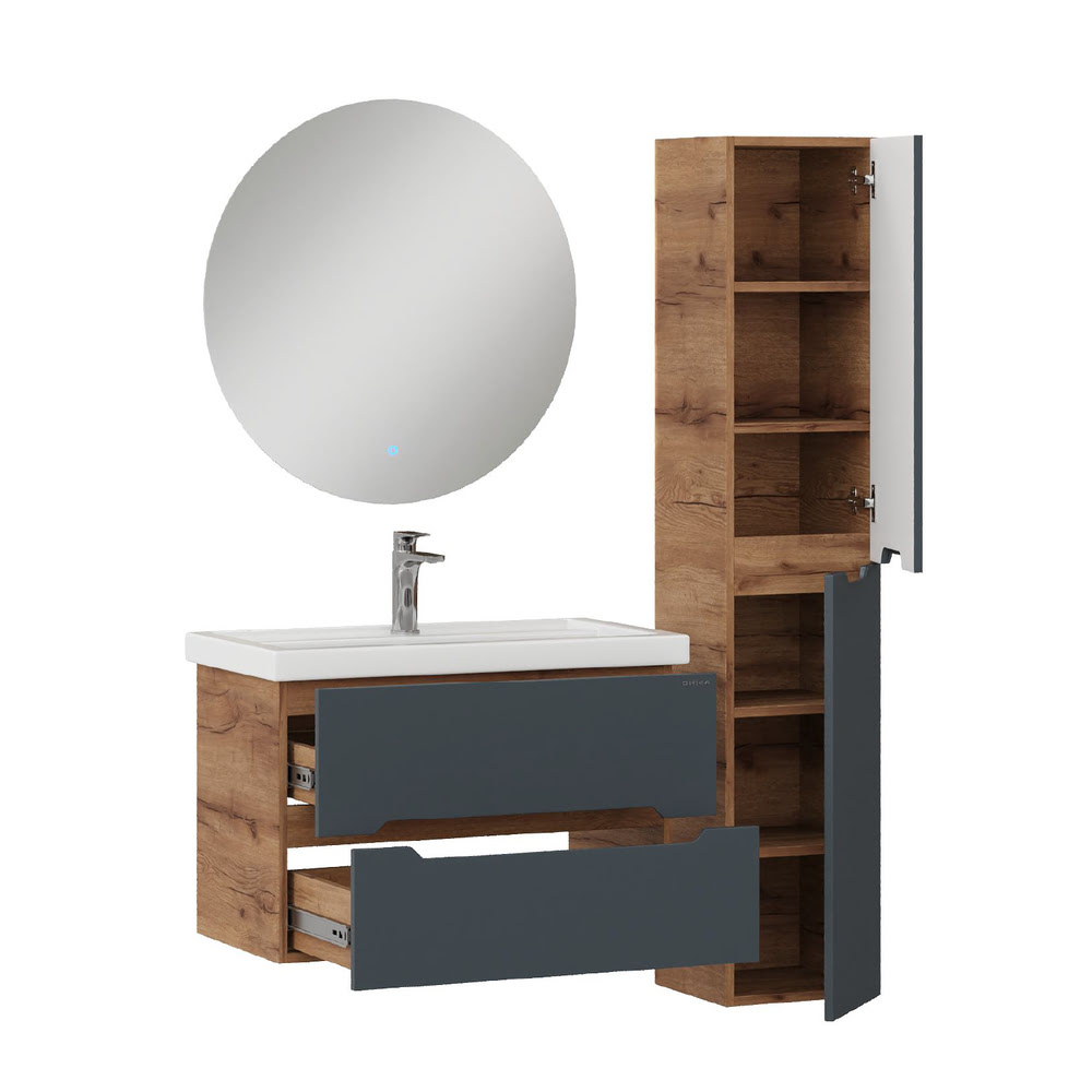 Тумба 70 см АЙЛЕНД подвесная Графит/дуб крафт золотой с умывальником Фостер-70: это отличное решение для ванной комнаты, сочетающее стиль и практичность. Тумба впишется в любой интерьер благодаря трендовому сочетанию матового графита и золотого дуба, а также поможет эффективно организовать пространство, что особенно важно в небольших ванных комнатах. У Тумба 70 см АЙЛЕНД подвесная Графит/дуб крафт золотой с умывальником Фостер-70 два ящика: верхний можно использовать для хранения косметики или средств для ухода, а в нижний удобно складывать полотенца или запасы бытовых принадлежностей. Элегантные ручки, органично интегрированные в фасады, делают использование мебели более комфортным и функциональным. Корпус тумбы изготовлен из ЛДСП, а фасады ящиков – из ЛМДФ в пленке, которые обеспечивают устойчивость к механическим повреждениям, перепадам температур и высокой влажности. Тумба надежно крепится к стене и не занимает место на полу, что упрощает уборку в ванной комнате. Подвесы для крепления тумбы — в комплекте.