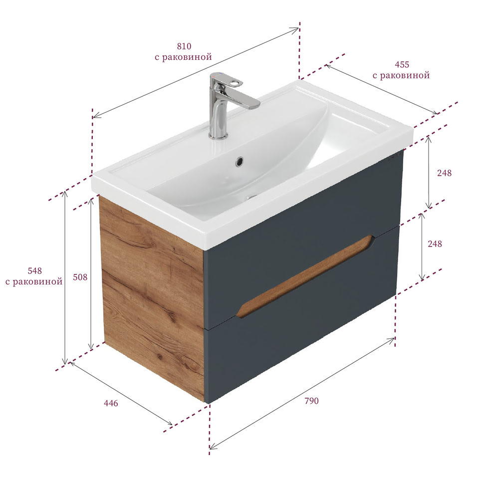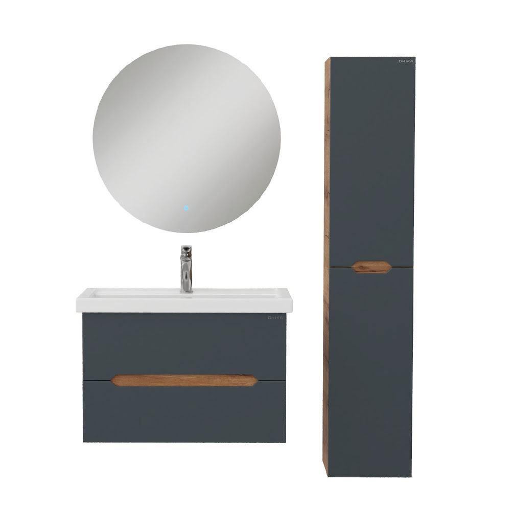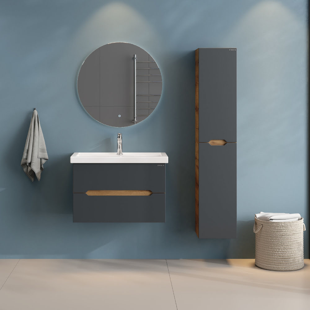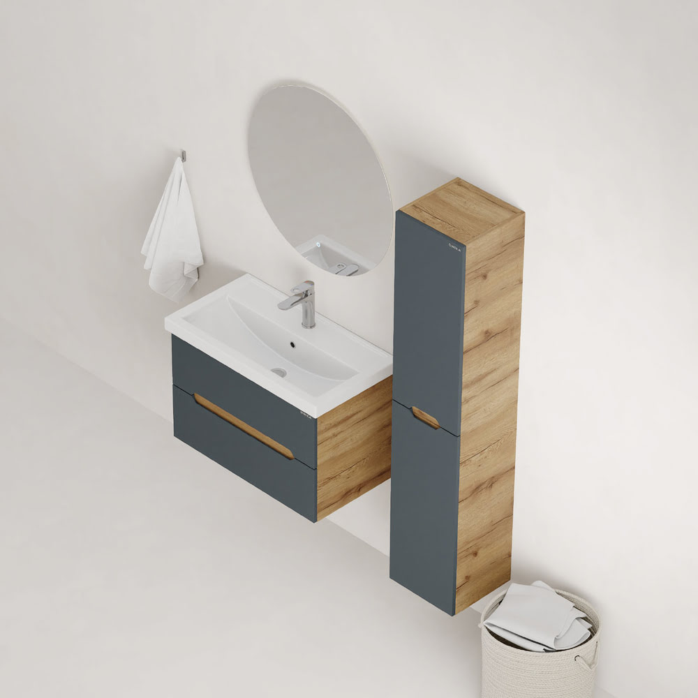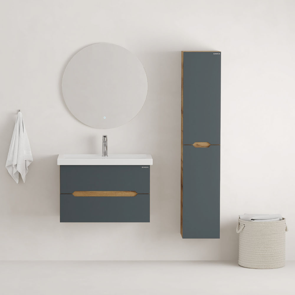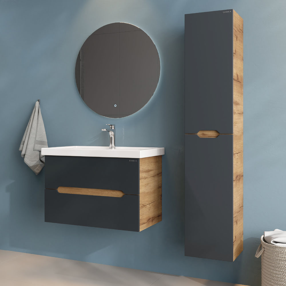 Тумба 80 см АЙЛЕНД подвесная Графит/дуб крафт золотой с умывальником Фостер-80: — это отличное решение для ванной комнаты, сочетающее стиль и практичность. Тумба впишется в любой интерьер благодаря трендовому сочетанию матового графита и золотого дуба, а также поможет эффективно организовать пространство, что особенно важно в небольших ванных комнатах. У Тумба 80 см АЙЛЕНД подвесная Графит/дуб крафт золотой с умывальником Фостер-80 два ящика: верхний можно использовать для хранения косметики или средств для ухода, а в нижний удобно складывать полотенца или запасы бытовых принадлежностей. Элегантные ручки, органично интегрированные в фасады, делают использование мебели более комфортным и функциональным. Корпус тумбы изготовлен из ЛДСП, а фасады ящиков – из ЛМДФ в пленке, которые обеспечивают устойчивость к механическим повреждениям, перепадам температур и высокой влажности. Тумба надежно крепится к стене и не занимает место на полу, что упрощает уборку в ванной комнате. Подвесы для крепления тумбы — в комплекте. Размеры тумбы без учета раковины 79х45х51х см. Совместимая раковина — Фостер-80 (Kirovit).