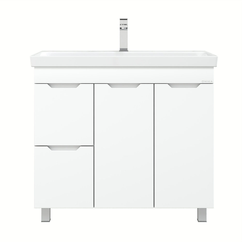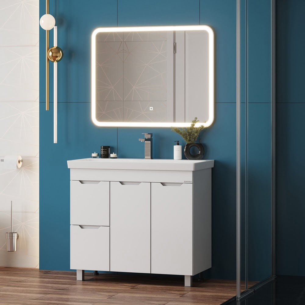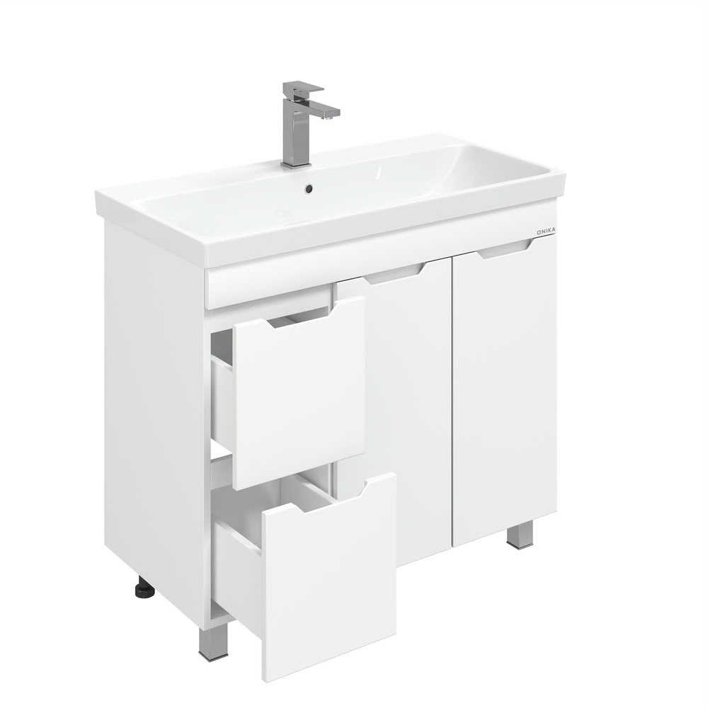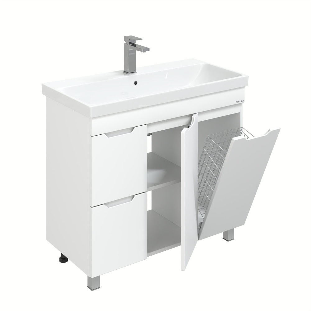 Напольная Тумба 90 см АЙЛЕНД с умывальником Адриана-90 — сочетает в себе стильный минималистичный дизайн, белую глянцевую поверхность и высочайшее качество исполнения. Тумба имеет два ящика с направляющими полного выдвижения, пространство за распашной дверцей с доводчиком и корзину для белья. Ручки, изящно интегрированные в фасады, позволяют сделать эксплуатацию мебели более удобной и практичной. Корпус тумбы выполнен из ЛДСП, фасады ящиков — из ЛМДФ в пленке, устойчивых к механическим воздействиям, перепадам температур и высокой влажности. Ножки (2 декоративных и 2 пластиковых) идут в комплекте с тумбой. Размеры тумбы без учета раковины 86x43x68 см. Совместимая раковина — Адриана-90 (Santek). Умывальник: ширина — 900 мм, глубина — 450 мм.
