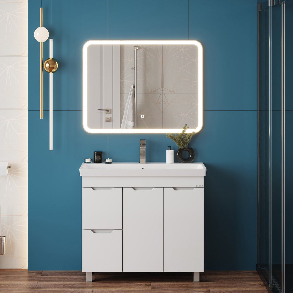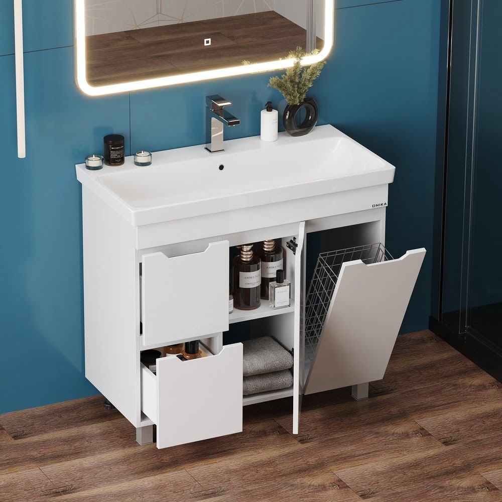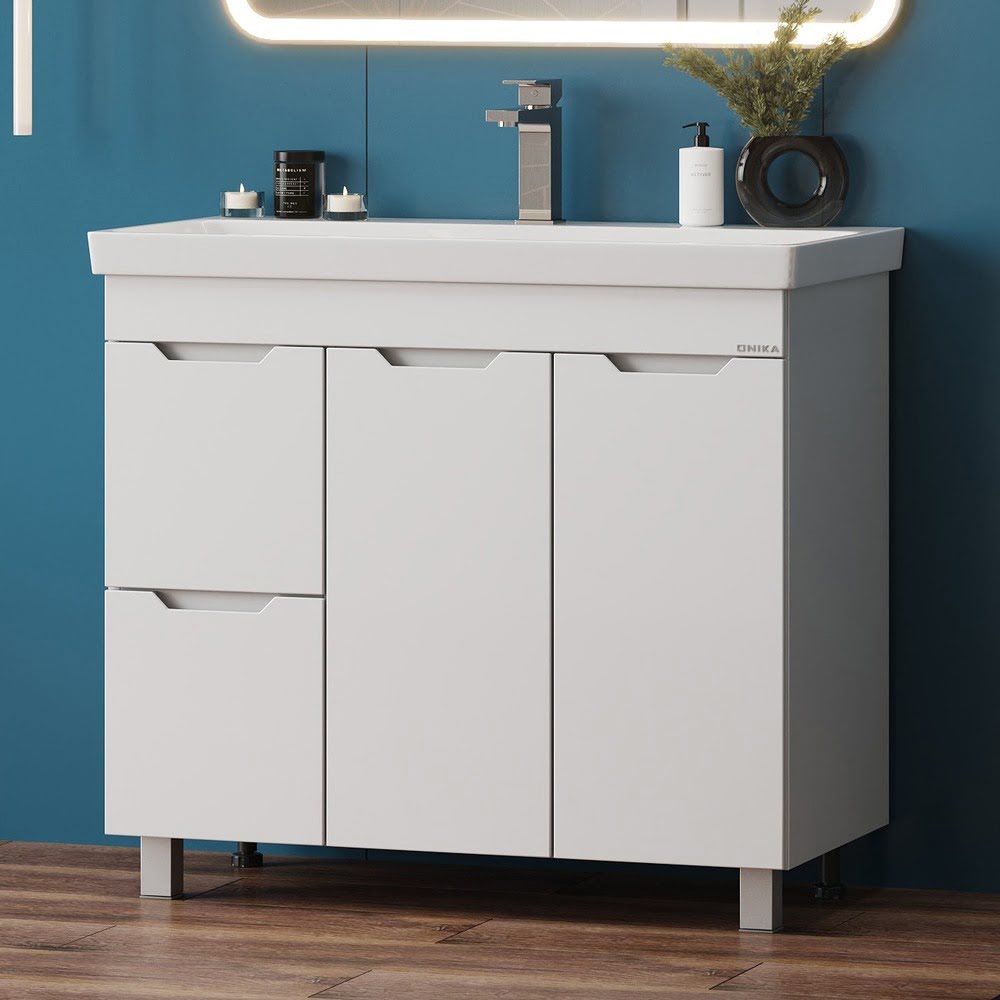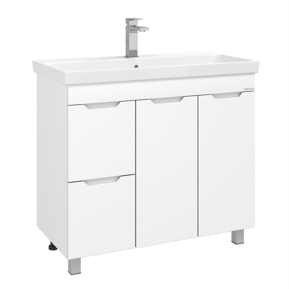 Напольная Тумба 90 см АЙЛЕНД с умывальником Адриана-90 — сочетает в себе стильный минималистичный дизайн, белую глянцевую поверхность и высочайшее качество исполнения. Тумба имеет два ящика с направляющими полного выдвижения, пространство за распашной дверцей с доводчиком и корзину для белья. Ручки, изящно интегрированные в фасады, позволяют сделать эксплуатацию мебели более удобной и практичной. Корпус тумбы выполнен из ЛДСП, фасады ящиков — из ЛМДФ в пленке, устойчивых к механическим воздействиям, перепадам температур и высокой влажности. Ножки (2 декоративных и 2 пластиковых) идут в комплекте с тумбой. Размеры тумбы без учета раковины 86x43x68 см. Совместимая раковина — Адриана-90 (Santek). Умывальник: ширина — 900 мм, глубина — 450 мм.