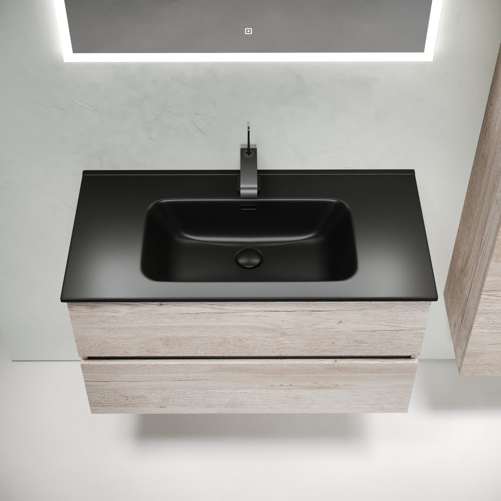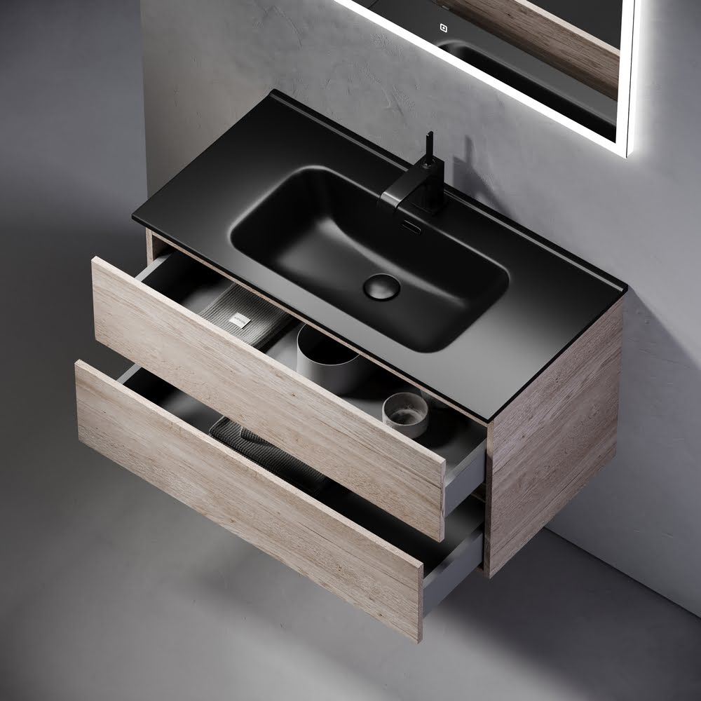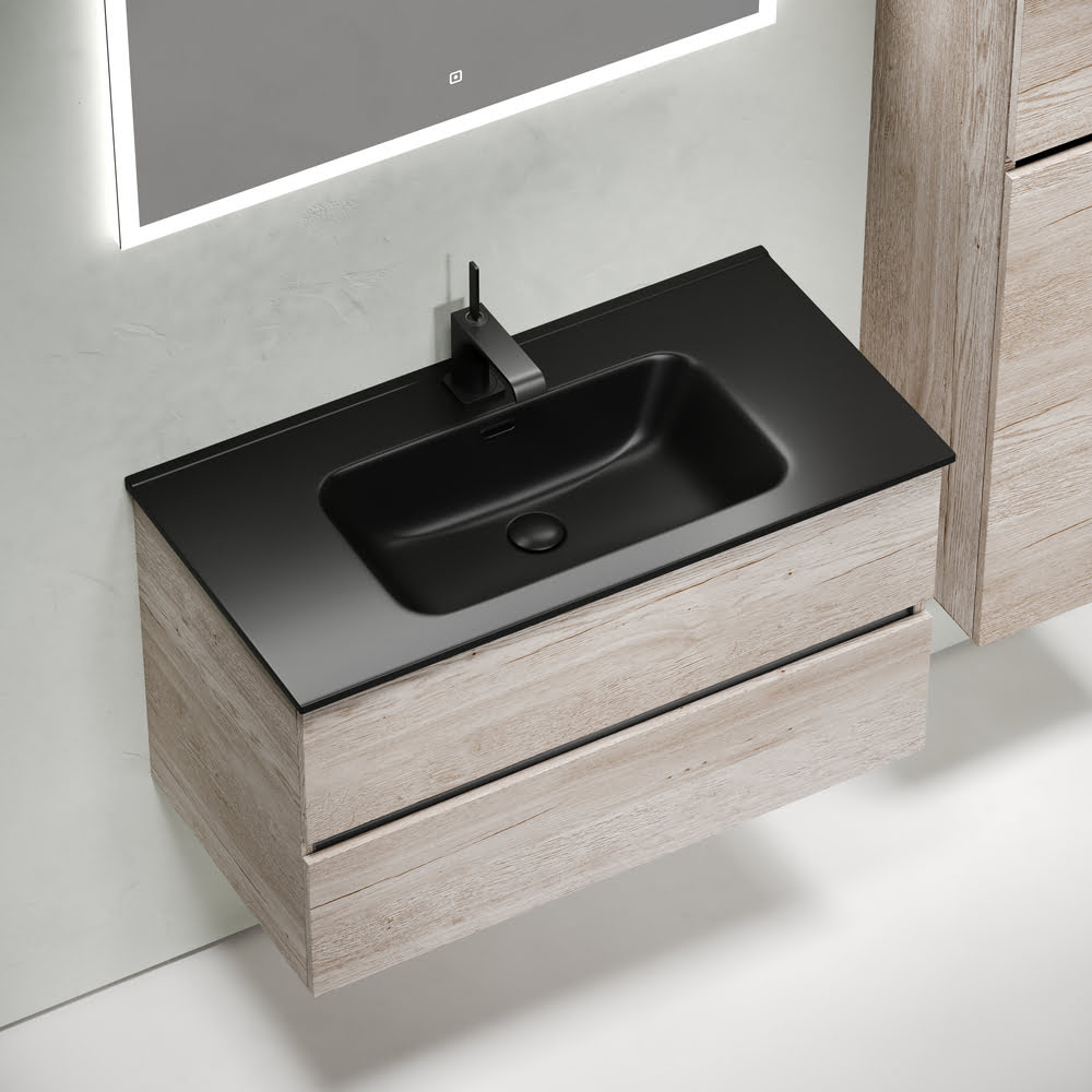 Тумба 90 см Urban ПОДВЕСНАЯ Sancos Дуб Галифакс с умывальником CN7002MB: c двумя ящиками оснащенными доводчиками скрытого монтажа с системой Soft close (плавного закрывания), c ручкой Gola (специальной скрытой ручкой, которая прикрепляется непосредственно на торцевой части фасада, но за которую можно держаться, при открытии и закрытии шкафчиков) по всей длине тумбы, цвет — Дуб Галифакс!!! Материал — ЛДСП. Комплектуется умывальником — CN7002MB. Размеры умывальника: ширина — 910 мм, глубина — 465 мм, высота — 180 мм. Монтаж тумбы — подвесной. ВНИМАНИЕ: Тумба 90 см Urban ПОДВЕСНАЯ Sancos ТАКЖЕ СОВМЕСТИМА с умывальниками — CN7002