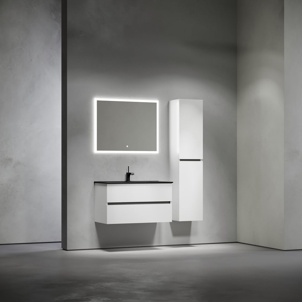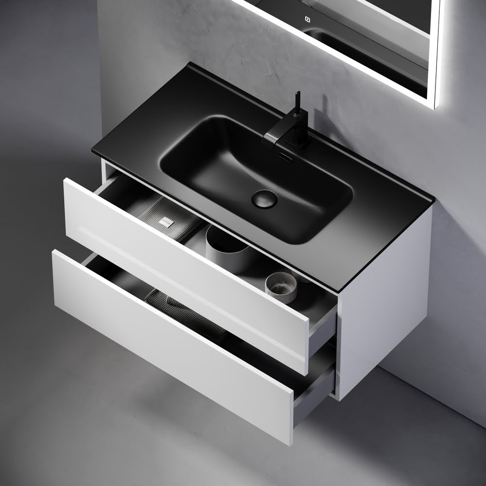 Тумба 90 см Urban ПОДВЕСНАЯ Sancos с умывальником CN7002MB: c двумя ящиками оснащенными доводчиками скрытого монтажа с системой Soft close (плавного закрывания), c ручкой Gola (специальной скрытой ручкой, которая прикрепляется непосредственно на торцевой части фасада, но за которую можно держаться, при открытии и закрытии шкафчиков) по всей длине тумбы, фасад — белый глянец КРАСКА!!! Материал — МДФ, корпус — ЛДСП. Комплектуется умывальником — CN7002MB. Размеры умывальника: ширина — 910 мм, глубина — 465 мм, высота — 180 мм. Монтаж тумбы — подвесной. ВНИМАНИЕ: Тумба 90 см Urban ПОДВЕСНАЯ Sancos ТАКЖЕ СОВМЕСТИМА с умывальниками — CN7002