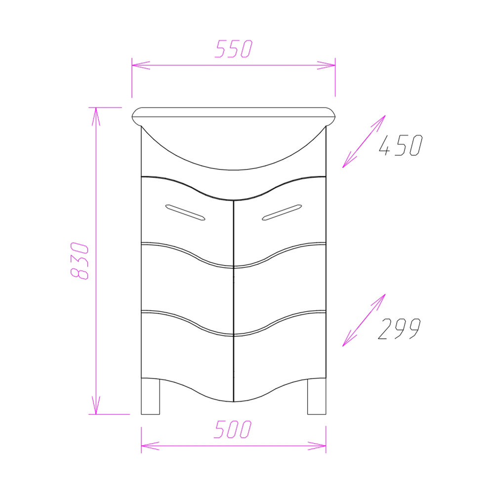 Размеры тумбы без учета раковины и ножек 50х30х75 см. Комплектуется умывальником Уют-55. Размеры умывальника: ширина — 550 мм, глубина — 450 мм..