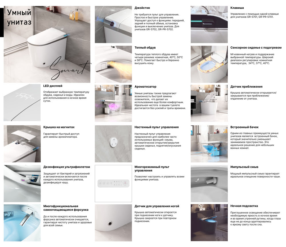 Умный унитаз-биде подвесной Grossman Smart GR-5701/Германия с системой импульсного смыва — идеальное решение для современного санузла. Этот инновационный продукт, обладая компактными размерами, не только украсит вашу ванную комнату, но и значительно облегчит каждодневные рутинные процедуры. С Grossman Smart GR-5701 вы забудете о неудобствах традиционного унитаза. Автоматическое открывание и закрывание сиденья, режимы омывания – общий, женский – делают процесс использования максимально комфортным для всей семьи. Подогрев сиденья с тремя температурами (34℃, 37℃, 40℃) подарит вам тепло и уют даже в самый прохладный день. Этот унитаз-биде – не только функциональный, но и стильный. LED дисплей и ночная подсветка добавляют современный акцент, а пульт дистанционного управления и управление одной кнопкой делают его использование еще проще. Более того, встроенный бачок избавляет вас от необходимости установки инсталляции, экономя пространство вашей ванной комнаты. Grossman Smart GR-5701 также оснащен рядом уникальных функций: самоочищающаяся форсунка, УФ стерилизация, автоматический смыв и ароматизатор – все для вашего максимального комфорта. Регулировка давления и температуры воды обеспечивает индивидуальный подход, а датчики приближения и ноги делают его использование еще более продуманным. Не упустите возможность сделать свои будни комфортнее! Унитаз-биде подвесной Grossman Smart GR-5701 – это не просто туалет, это целый комплекс для заботы о вашей гигиене и удобстве. Придите к новому уровню комфорта – выберите Grossman Smart GR-5701 и наслаждайтесь каждой минутой! Поставляется в коробке из картона. Способ установки — подвесной.